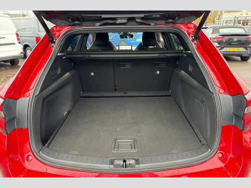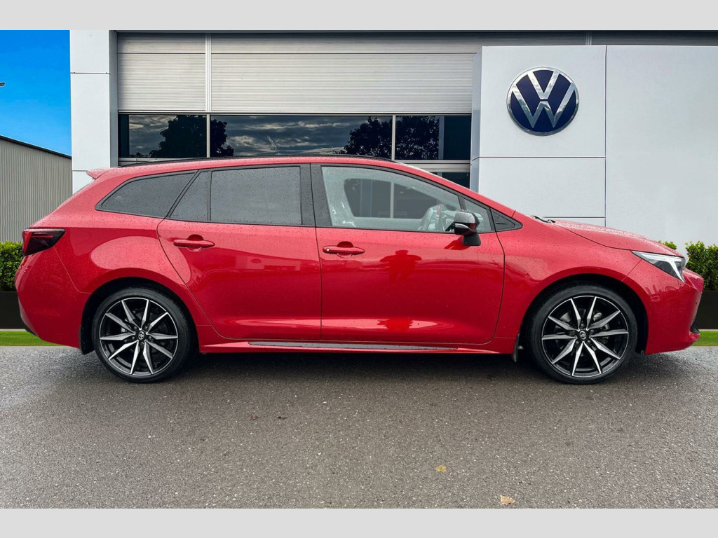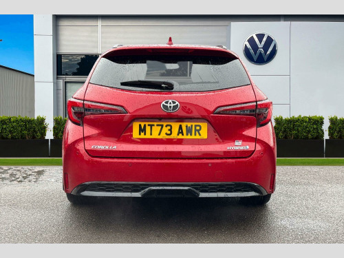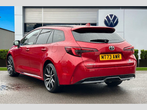 Now available to purchase at Wrexham Volkswagen is this Toyota Corolla GR Sport. Powering this Corolla is a 2.0L petrol hybrid engine that produces 196 BHP with automatic transmission. The exterior, which is finished in a stylish red paintwork, has a range of features on offer. To the front of the vehicle you'll find the LED headlights that provide exceptional visibility, and to the side the rear tinted windows for passenger privacy and the 18in alloy wheels. For added convenience this Corolla also features a set of roof rails, electric tailgate, and parking sensors that assist with maneuvering alongside the rear view camera.