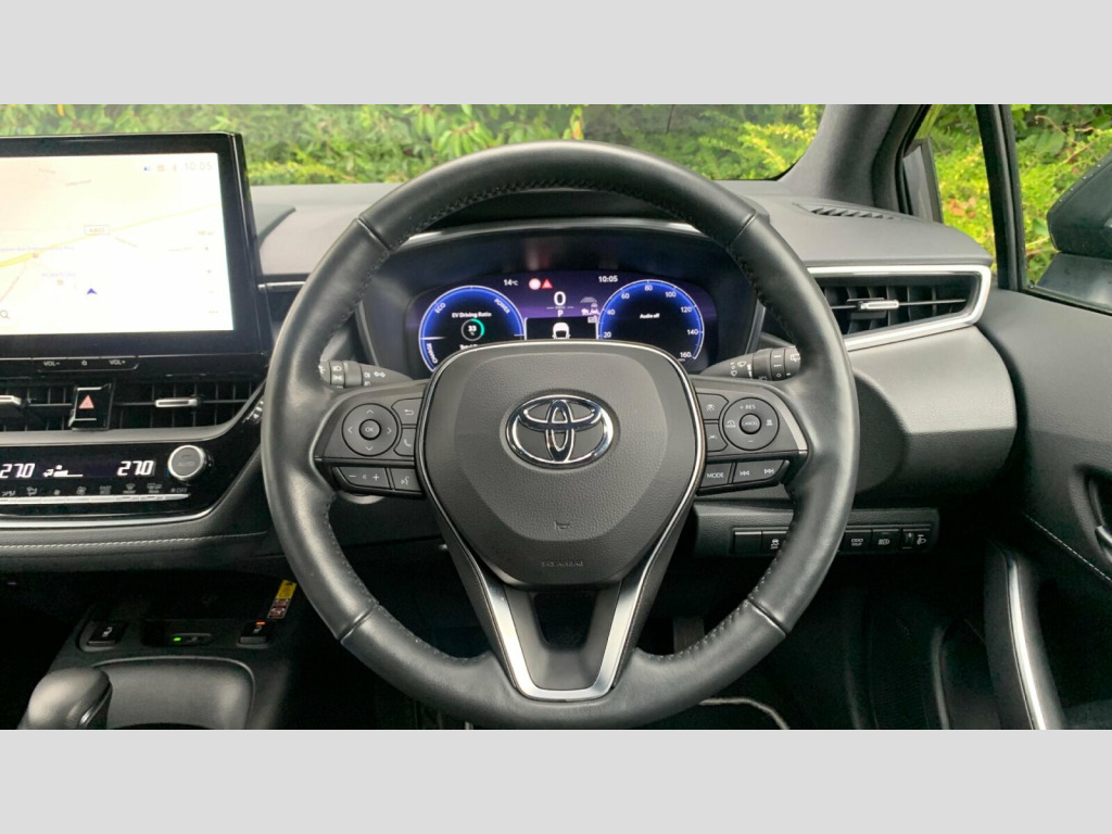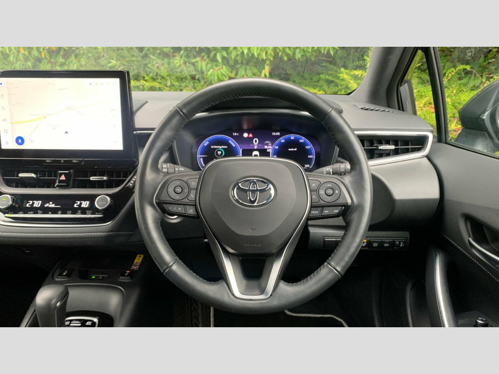 This 2024 Toyota Corolla VVT-h Icon is a Toyota manufacturer approved vehicle with a full dealership service history, having had only one owner. It boasts an MOT valid until May 2027 and its last service was completed on 26 April 2025 at 10,536 miles. This Euro 6 compliant model features a 1.8L petrol hybrid engine and comes with a 12-month warranty for your peace of mind. Notable features include LED headlights, a smart entry system with keyless entry, and smartphone integration for both Apple CarPlay and Android Auto. For added comfort, it offers heated seats and adaptive cruise control with a speed limiter.