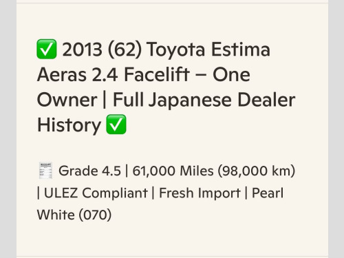 ONE OWNER FROM BRAND NEW**FULL JAPANESE SERVICE HISTORY PRESENT**PLEASE MENTION STOCK ID IM407 WHEN CALLING**SEVEN SEATER**ULEZ COMPLIANT**25/01/2013 REGISTERED DATE** GRADE 4.5 ** ( A VERY CLEAN ESTIMA AERAS )**FRONT FOG LIGHTS**XENON LIGHTS**WINKER MIRRORS**PRIVACY GLASS**REAR SPOILER**REMOTE POWER SLIDE DOORS**FACTORY STANDARD 18'' ALLOYS WHHELS**SMART KEYS X2**HDD/SD/BLUETOOTH ALL OK**LEATHER STEERING WHEEL**CRUISE CONTROL**DUAL CLIMATE CONTROL**REAR BOOT BOARD**AIR BAGS**ABS**NON SMOKER INTERIOR**DELAER ORIGINAL FLOOR CARPETS**ALL TOYOTA RECALLS COMPLETED**LOTS MORE....WE ARE DELIGHTED TO BE SELLING THIS STUNNING WELL LOOKED AFTER LOW MILEAGE TOYOTA ESTIMA AERAS ( FACELIFT) ( ACR50 MODEL ) THAT WE HAVE JUST IMPORTED ..PRESENTED IN PEARL WHITE ( COLOUR CODE: 070 ) WITH EXCELLENT CONDITION BLACK CLOTH UPHOLSTERYJUST BEEN MOT AND A ENGINE SERVICE AND TRANSMISSION SERVICE HAS BEEN COMPLETED WITH NO ADVISORY...This vehicle comes with a verified VX report, equivalent to the UK HPI report, confirming no mileage discrepancies or hidden accidents. A certificate will be providedThis example drives as it should with no warning light's on the dashboard after extended test drive.The car drives beautifully,The automatic gearbox is excellent with seamless gear changes,The price includes 12 months Nationwide comprehensive PREMIER warranty from a uk leading warranty company,Covering over 8000 electrical and mechanical parts, The policy covers parts and labour cost's,Nationwide cover.Have complete peace of mind, with the Wanstead Carriages promise All our vehicles are HPI Checked,a copy of the certificate is given with each vehicle, every vehicle is subject to a rigorous multi point pre-delivery inspection,AA/RAC Inspection are Welcome/12 Months AA Breakdown cover also includedWE ARE VERY PROUD TO BE A PART OF THE AA CARS STANDARDS WHICH IS APPROVED BY THE CHARTERED TRADING STANDARDS INSTITUTE,SO YOU CAN PURCHASE YOUR NEXT VEHICLE FROM WANSTEAD CARRIAGES IN CONFIDENCE** 3 point rear seat belts, air conditioning, airbags, alarm, alloy wheels, cd player, central locking, child locks & isofix system, cruise control, electric door mirrors, electric windows, folding rear seats, height adjustable drivers seat, immobiliser, lumbar support, parking aid, leather seats, power steering, radio, remote central locking, sunroof, traction control, we know that buying a car may feel daunting but here at wanstead carraiges we make things simple and hassle-free, we are autobahn finance approved dealers and offer flexible and competitive finance terms and rates to suit all budgets and circumstances ..please contact, the application for car finance is quick and easy and most of our applicants get an answer within a few hours, try us today to see what we could do for you, this vehicle has never been smoked in and there is no evidence it has been used to carry pet's, certainly no lingering smells, reserve this car today--a deposit of £200 will secure this car until you get over to view it within a few days, deposit is refundable should you feel the car does not meet your expectations, we are an aa gold standard trusted dealer so you can purchase your next vehicle from wanstead carriages in confidence, finance can be arranged at very competitive rates, also door to door delivery service is available, please call or email us to book a personally appointed time for a viewing of this vehicle., we allow generous time for viewings, offering plenty of opportunity for you to look around and inspect the vehicle, staff at wanstead carriages respect that you won't want us hovering over and pressurising you, we understand that you may wish to have your own space, but enjoy the benefit of a knowledgeable team members immediate attention when required