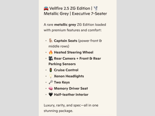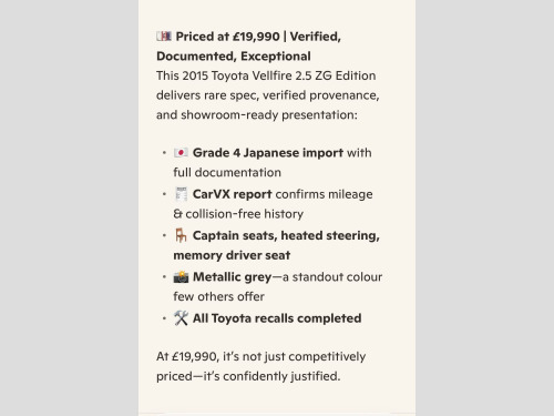 ONE OWNER FROM JAPAN WITH A FULL JAPANESE SERVICE HISTORY**PLEASE MENTION STOCK ID IM391 WHEN CALLING**REG DATE:27/07/2015**TOP OF THE RANGE**ULEZ COMPLIANT**GRADE 4 (VERY CLEAN EXAMPLE)**HALF LEATHER INTERIOR WITH POWER ASSIST FRONT AND MIDDLE SEATS**MEMORY POSITIONS FOR DRIVER SEAT**HEATED STREEING WHEEL**REAR CAMERA**ALL AROUND PARKING SENSORS**CRUISE CONTROL**DUAL CLIMATE CONTROL**18''ALLOYS WITH 2023 RADIAL TIRES**REMOTE POWER SLIDE DOORS AND REAR GATE**CURTAIN AIRBAGS**TRACTION CONTROL**AUTO FOLDING DOOR MIRRORS**AUTO WIPERS**SMART KEYS X2**BLUETOOTH**XENON LIGHTS HEAD LIGHTS**WE ARE DELIGHTED TO BE SELLING THIS STUNNING WELL LOOKED AFTER VELLFIRE THAT WE HAVE JUST IMPORTED PRESENTED IN A VERY REAR COLOUR METALLIC GREY- COLOUR CODE IG3 WITH EXCELLENT CONDITION UPHOLSTERYMOT COMPLETED WITH NO ADVISORIES.ENGINE AND TRANSMISSION SERVICE CARRIED OUT,ENSURING OPTIMAL PERFORMANCE AND RELIABILITY....A CLEAN VX REPORT-JUST LIKE A CLEAN UK HPI REPORT-INDICATES NO RECORDED ISSUES-MILEAGE-THEFT-ACCIDENTSThis vehicle comes with a verified VX report, equivalent to the UK HPI report, confirming no mileage discrepancies or hidden accidents. A certificate will be providedThis example drives as it should with no warning light's on the dashboard after extended test drive.The car drives beautifully,The automatic gearbox is excellent with seamless gear changesThe price includes 12 months Nationwide comprehensive PREMIER warranty from a uk leading warranty company,Covering over 8000 electrical and mechanical parts, The policy covers parts and labour cost's,Nationwide coverHave complete peace of mind, with the Wanstead Carriages promise All our vehicles are HPI Checked,a copy of the certificate is given with each vehicle, every vehicle is subject to a rigorous multi point pre-delivery inspectionAA/RAC Inspection are Welcome/12 Months AA Breakdown cover also includedWE ARE VERY PROUD TO BE A PART OF THE AA CARS STANDARDS WHICH IS APPROVED BY THE CHARTERED TRADING STANDARDS INSTITUTE,SO YOU CAN PURCHASE YOUR NEXT VEHICLE FROM WANSTEAD CARRIAGES IN CONFIDENCE know that buying a car may feel daunting but here at wanstead carraiges we make things simple and hassle-free, we are autobahn finance approved dealers and offer flexible and competitive finance terms and rates to suit all budgets and circumstances ..please contact, the application for car finance is quick and easy and most of our applicants get an answer within a few hours, try us today to see what we could do for you, this vehicle has never been smoked in and there is no evidence it has been used to carry pet's, certainly no lingering smells, reserve this car today--a deposit of £200 will secure this car until you get over to view it within a few days, deposit is refundable should you feel the car does not meet your expectations, we are an aa gold standard trusted dealer so you can purchase your next vehicle from wanstead carriages in confidence, finance can be arranged at very competitive rates, also door to door delivery service is available, please call or email us to book a personally appointed time for a viewing of this vehicle., we allow generous time for viewings, offering plenty of opportunity for you to look around and inspect the vehicle, staff at wanstead carriages respect that you won't want us hovering over and pressurising you, we understand that you may wish to have your own space, but enjoy the benefit of a knowledgeable team members immediate attention when required, 3x3 point rear seat belts, airbags, air conditioning, alarm, alloy wheels, cd player, central locking, child locks & isofix system, cruise control, electric windows, electric door mirrors, folding rear seats, height adjustable drivers seat, immobiliser, leather seats, power steering, parking aid, lumbar support, remote central locking, radio, traction control, sunroof