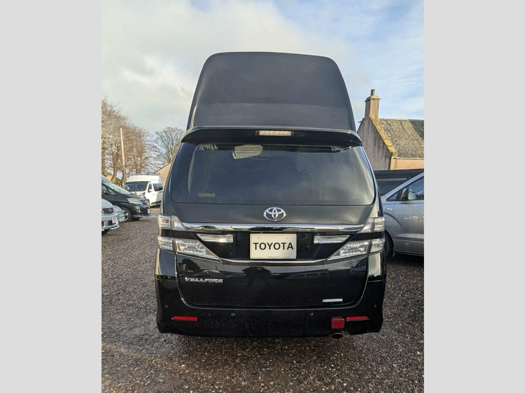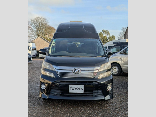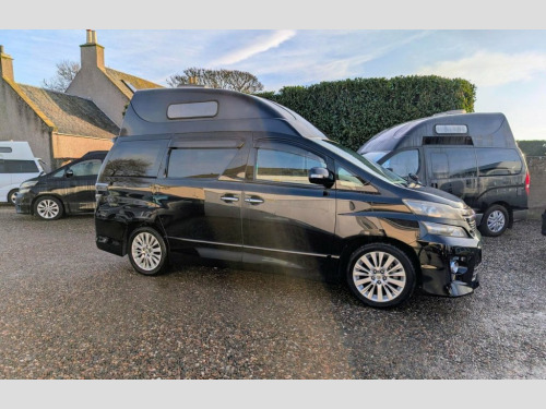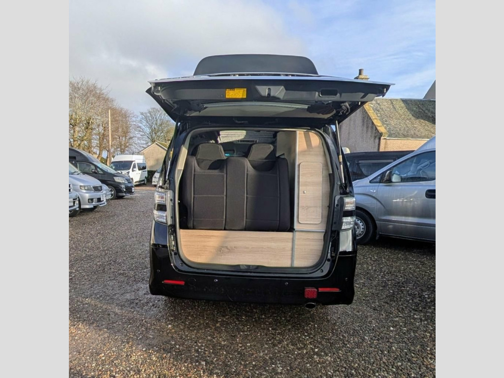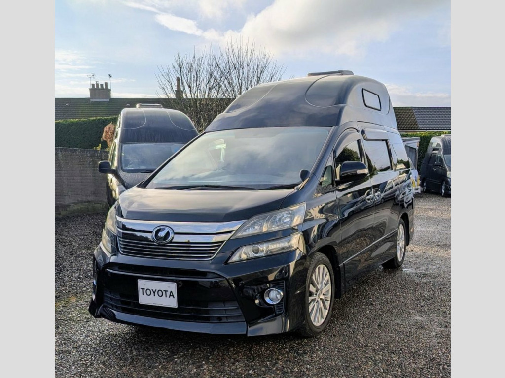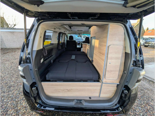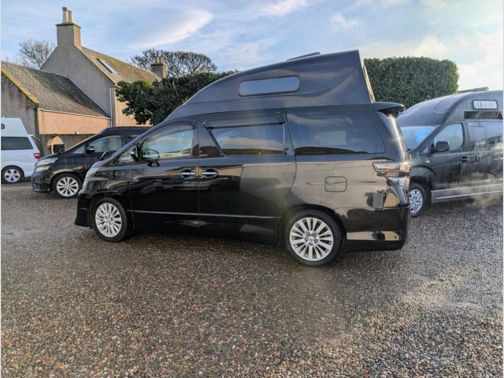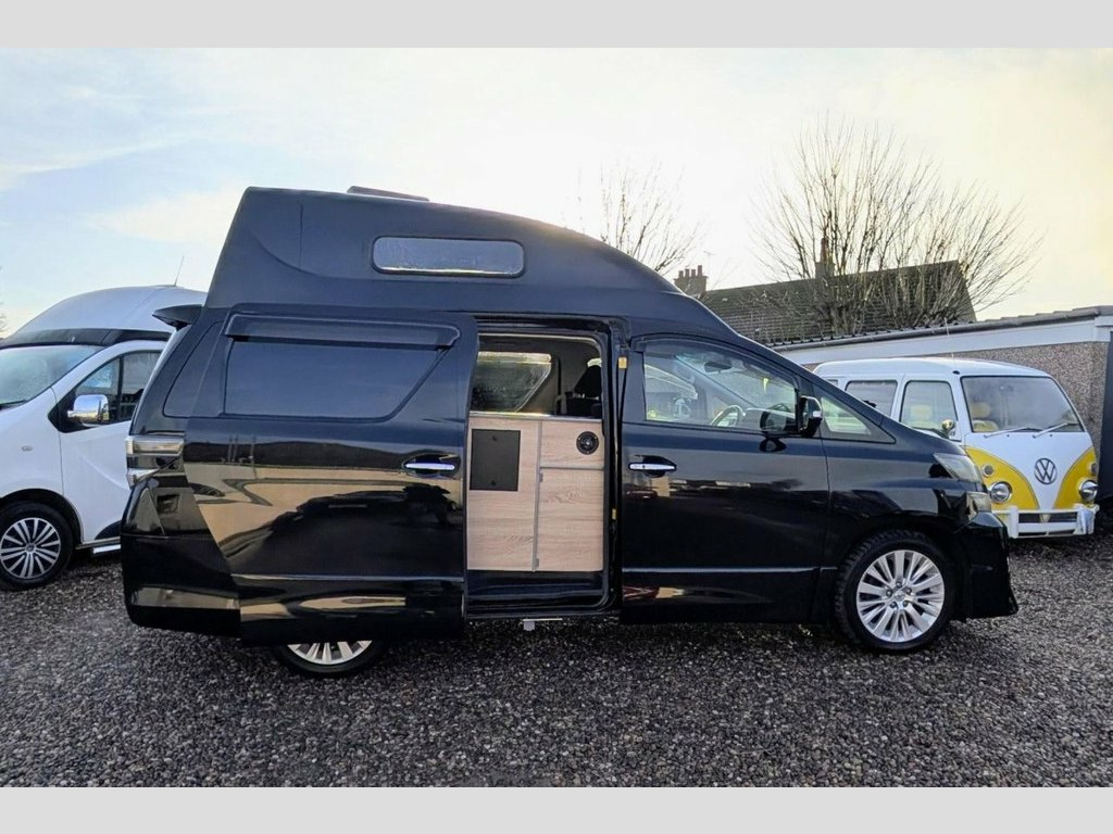 Replace your car today with an everyday Campervan! Embark on your next adventure in style and comfort with this beautifully converted Toyota Vellfire Campervan. Known for its sleek, sporty and modern design, the Vellfire offers a premium camping experience that's perfect for exploring the open road. The Vellfire combines modern elegance with utility, offering a smooth drive and spacious interior. It's designed to make every road trip a memorable experience, whether you're driving day to day, hitting the coast, mountains, or countryside. It's the ideal goldilocks sized campervan: small enough to park and drive easy, but large enough to provide ample living space. Awnings, cycle carrier towbars or other accessories can be added, please contact us for details. Hightop, Sleeps 4, Passenger Swivel Seat, Seats 4 , Kitchen area with fridge, a sink and 2 b, Built in Cupboards and clever storage so, Toilet Facilities: Port Potti Storage Cu, Finished Wood Surfaces, LED Lighting, 12v Leisure Battery System, 240v Mains Electric Hook Up, Gas Box, Freshwater System, Curtains, Pop Up Table, Silver Screens, Air Conditioning, Alloy Wheels, Tinted windows, Twin Sliding Doors, Rear Tailgate Door