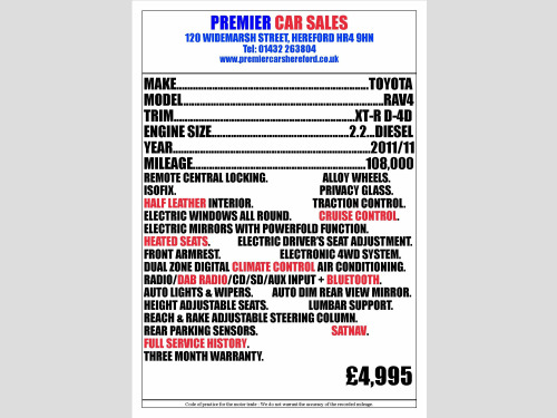 A well maintained, nicely specified, one owner from new Four Wheel Drive. Remote Central Locking with three keys present. Rear Parking Sensors. Alloy Wheels. Half Leather Interior. Front Armrest. Electric Windows all round. Electric Mirrors with powerfold facility. Dual Zone Digital Climate Control Air Conditioning. Heated Seats. Height Adjustable Drivers Seat. Electric Seat Adjustment. Electrically Adjustable Lumbar Support. Cruise Control. Electronically switchable four wheel drive system. Auto Dim Rear View Mirror. Auto Lights. Auto Wipers. Traction Control System. ISOFIX. Reach & Rake Adjustable Steering Column. Privacy Glass. SATNAV. Radio/DAB Radio with CD and SD Card Reader, AUX Input + Bluetooth Connection. Full Service History. We are at 120 Widemarsh Street, Hereford, HR4 9HN. Our website with full details is : www.premiercarshereford.co.uk, All of our vehicles are supplied with a three month warranty and long MOT. Card payments are welcomed and part exchanges are gladly considered. Low rate finance arranged, subject to status. Please call us on 01432263804 or 07831564655 for more information.