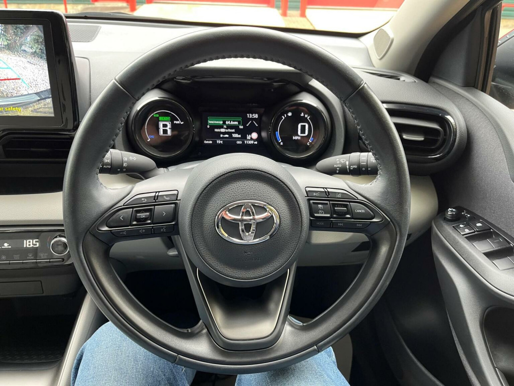 This 2022 Toyota Yaris VVT-h Excel is a remarkable find, having been driven only 11,000 miles by a single owner.  As a Euro 6 compliant model, it boasts a 1.5 litre petrol hybrid engine, offering an impressive fuel economy of up to 66 miles per gallon and low CO2 emissions.  The Excel trim level ensures a well equipped driving experience, featuring Toyota Safety Sense 2, which includes adaptive cruise control for effortless journeys.  Youll also benefit from automatic headlights, blind spot monitoring for enhanced awareness, and seamless smartphone integration with Apple CarPlay and Android Auto, all accessible through Bluetooth connectivity. This Yaris Excel stands out with its exceptional fuel efficiency and low mileage, indicating it has been well cared for and offers significant savings on running costs compared to similar vehicles. The inclusion of advanced safety features like blind spot monitoring and adaptive cruise control provides peace of mind, while the smartphone integration keeps you connected and entertained on the go. This combination of economical hybrid technology, comprehensive safety equipment, and modern connectivity makes this Toyota Yaris a truly compelling choice. 2 x original keys, 1 OWNER FROM NEW, FULL TOYOTA SERVICE HISTORY, LOVELY LITTLE CAR