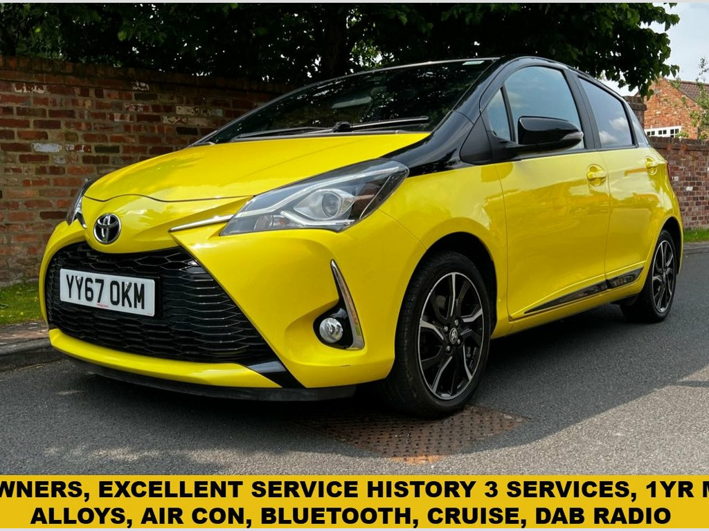 Toyota Yaris 1.5 VVT-i Bi-Tone Limited Edition (67 Plate) – Eye-Catching Yellow | 5dr Hatchback | Manual | Petrol | Euro 6 Stand out from the crowd with this Limited Edition Toyota Yaris Bi-Tone in vibrant Yellow with contrasting black roof and mirrors. A stylish, reliable, and efficient hatchback 3 owners from new Excellent condition with a good service history as follows 21/10/20 at 15485 miles, 15/04/22 at 20371 miles, 14/08/23 at 30139 miles New service included for the buyer. 1 year new MOT HPI clear for total peace of mind. Key Features: 1.5L VVT-i Petrol Engine (111 PS) – Smooth and responsive Alloy Wheels Bluetooth Connectivity Cruise Control Air Conditioning Euro 6 Emissions Compliant Additional Benefits: 3 Months Warranty included (with options to extend) Part Exchange Welcome Finance Available on Request This is a fantastic opportunity to own a rare, well-maintained Toyota Yaris that's perfect for city driving, commuting, or first-time drivers. Don't miss out on this Limited Edition – book your test drive today! 16in Alloy Wheels - Machined, Bluetooth Connectivity, Cruise Control, Rain Sensing Wipers, DAB Digital Radio, 3-Spoke Leather Steering Wheel, ABS - Anti Lock Braking System, Active Headrests, Audio Switches on Steering Wheel, Auto Up and Down Function on Drivers Win, Chrome Surrounds on Front Fog Lights, Daytime Running Lights - LED, Electric Power Steering - EPS, Emergency Brake-Light Signal - EBS - Haz, Follow Me Home Headlights, Front and Rear Cupholders, Front Fog Lights, Front Passenger Airbag On-Off Switch, Front Power Windows, Glovebox, HAC - Hill Start Assist Control, High Mounted Rear Brake Light - LED, Honeycomb Lower Front Grille, Immobiliser, ISOFIX Fixing Points, Leather Gear Sh