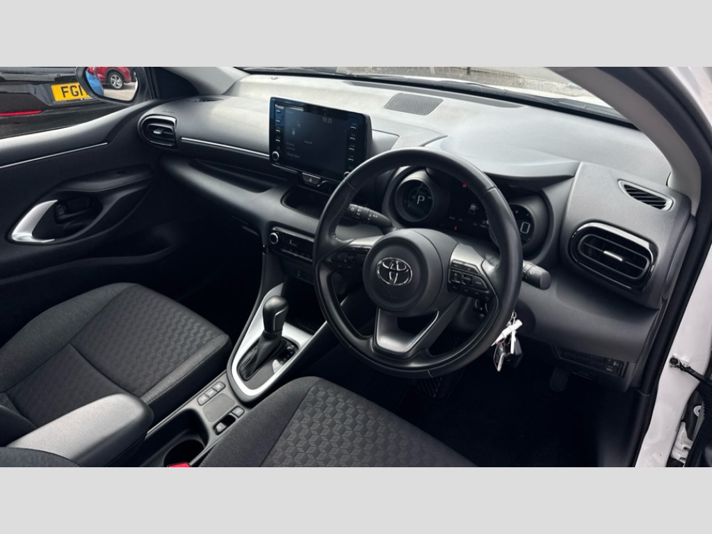 This Toyota Yaris 1.5 Hybrid Design 5dr CVT is finished in White, Metallic effect paint with Black upholstery and comes with DAB Radio, Bluetooth, Electric Windows, Climate Control, Reverse Camera, Lane Assist and many more features. Adaptive cruise control, Adjustable speed limit with speed warning, Bluetooth connectivity, Colour binocular inspired displays with digital speedometer, E-call, Electric power steering, Hybrid energy display, Multi information display switches on steering wheel, Reversing camera, Smartphone integration with Apple CarPlay and Android auto, Voice recognition, Vehicle Stability Control (VSC), 4 speakers, 8" Multimedia display touch screen, USB connection, Acoustic windscreen glass, Auto windscreen wipers, Automatic headlights, Body coloured door mirrors, Electric adjustable heated door mirrors, Follow me home headlights, Front auto power windows with anti jam protection, Full LED rear lights, LED daytime running lights, LED front fog lights, LED front light guide, LED Headlights, LED High mounted stop lamp, LED Indicators, LED rear light guide, Manual headlight levelling, Painted chequered front grille, Rain sensor, Rear auto power windows with anti jam protection, Rear privacy glass, Rear side wing doors, Rear spoiler, Rear wiper, Shark fin antenna, Turning signal integrated indicators in door mirrors, 3 adjustable rear headrests, 3 spoke leather steering wheel, 60/40 split folding rear seat, Active headrests, Adjustable boot height, Auto air conditioning, Coat hooks in rear grab handles, Cup holders (2 front & door), Data Communication Module (DCM) connected services, Fabric upholstery, Front armrest, Glovebox, Grey roof lining, Height adjustable driver's seat, Isofix seat fixing, Leather gearshift, Pollen filter, Shopping bag hooks, Single front passenger seat, Tilt/telescopic steering column, 3 point seatbelts on all rear seats, ABS+EBD+Brake assist, Electronic parking brake, Emergency brake light system (EBS), Front passenger airbag on/off switch, Front seatbelt reminder, Hill start assist control (HAC), Rear child proof door locks, Rear seat belt reminder, Supplemental Restraint System (SRS) 8 airbags: Driver & passenger's airbags, dual side curtain airbags, side impact airbags, front centre airbag, Toyota Safety Sense 2, Precollison + Night time Pedestrian & Cyclist Detection, Lane Trace Assist, Auto High Beam, Intelligent ACC & Road Sign Assist, Tyre pressure warning system, 2x Master key, Alarm/immobiliser, Remote powered central double locking doors, Soft touch instrument panel, Space saver spare wheel