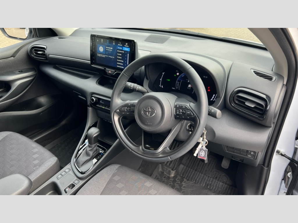 Toyota Yaris 1.5 Hybrid Design 5dr CVT 7" Digital Combimeter, Adaptive cruise control, Adjustable speed limit with speed warning, Bluetooth connectivity, Colour binocular inspired displays with digital speedometer, E-call, Electric power steering, Hybrid energy display, Multi information display switches on steering wheel, Reversing camera, Smartphone integration with Apple CarPlay and Android auto, Tailgate, Voice recognition, Vehicle Stability Control (VSC), 4 speakers, 9" Multimedia touch display, Toyota Touch 3 system with DAB radio, USB connection, Acoustic windscreen glass, Auto windscreen wipers, Automatic headlights, Body coloured door mirrors, Electric adjustable heated door mirrors, Follow me home headlights, Front auto power windows with anti jam protection, Full LED rear lights, LED daytime running lights, LED front fog lights, LED front light guide, LED Headlights, LED High mounted stop lamp, LED Indicators, LED rear light guide, Manual headlight levelling, Painted chequered front grille, Rain sensor, Rear auto power windows with anti jam protection, Rear privacy glass, Rear side wing doors, Rear spoiler, Rear wiper, Shark fin antenna, Turning signal integrated indicators in door mirrors, Variable front intermittent wipers, 3 adjustable rear headrests, 3 seat bench in 2nd row, 3 spoke leather steering wheel, 60/40 split folding rear seat, Active headrests, Adjustable boot height, Auto air conditioning, Coat hooks in rear grab handles, Cup holders (2 front & door), Data Communication Module (DCM) connected services, Fabric upholstery, Front armrest, Glovebox, Grey roof lining, Height adjustable driver's seat, Isofix seat fixing, Leather gearshift, Pollen filter, Shopping bag hooks, Single front passenger seat, Tilt/telescopic steering column, Safety pack - Yaris, 3 point seatbelts on all rear seats, ABS+EBD+Brake assist, Electronic parking brake, Emergency brake light system (EBS), Front passenger airbag on/off switch, Front seatbelt reminder, Hill start assist control (HAC), Rear child proof door locks, Rear seat belt reminder, Supplemental Restraint System (SRS) 8 airbags: Driver & passenger's airbags, dual side curtain airbags, side impact airbags, front centre airbag, Toyota Safety Sense 3 with over the air updates, Tyre pressure warning system, 2x Master key, Alarm/immobiliser, Remote powered central double locking doors, Soft touch instrument panel, Space saver spare wheel