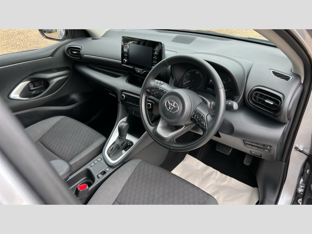 Toyota Yaris 1.5 Hybrid Icon 5dr CVT 4.2" coloured TFT multi information display with analogue speedometer, Adaptive cruise control, Adjustable speed limit with speed warning, Bluetooth connectivity, E-call, Electric power steering, Hybrid energy display, Multi information display switches on steering wheel, Reversing camera, Smartphone integration with Apple CarPlay and Android auto, Tailgate, Voice recognition, Vehicle Stability Control (VSC), 4 speakers, 7" Multimedia display touch screen, Toyota Touch 2 with DAB, USB connection, Acoustic windscreen glass, Auto windscreen wipers, Automatic headlights, Body coloured door mirrors, Bulb indicators, Chequered front grille, Daytime running lights, Electric adjustable heated door mirrors, Follow me home headlights, Front auto power windows with anti jam protection, Halogen projector headlights, LED High mounted stop lamp, Manual headlight levelling, Rain sensor, Rear side wing doors, Rear spoiler, Rear wiper, Shark fin antenna, Turning signal integrated indicators in door mirrors, Variable front intermittent wipers, 3 adjustable rear headrests, 3 spoke leather steering wheel, 60/40 split folding rear seat, Active headrests, Adjustable boot height, Auto air conditioning, Coat hooks in rear grab handles, Cup holders (2 front & door), Data Communication Module (DCM) connected services, Fabric upholstery, Front armrest, Glovebox, Grey roof lining, Height adjustable driver's seat, Isofix seat fixing, Leather gearshift, Pollen filter, Shopping bag hooks, Single front passenger seat, Tilt/telescopic steering column, 3 point seatbelts on all rear seats, ABS+EBD+Brake assist, Electronic parking brake, Emergency brake light system (EBS), Front passenger airbag on/off switch, Front seatbelt reminder, Hill start assist control (HAC), Rear child proof door locks, Rear seat belt reminder, Supplemental Restraint System (SRS) 8 airbags: Driver & passenger's airbags, dual side curtain airbags, side impact airbags, front centre airbag, Toyota Safety Sense 2, Precollison + Night time Pedestrian & Cyclist Detection, Lane Trace Assist, Auto High Beam, Intelligent ACC & Road Sign Assist, Tyre pressure warning system, 2x Master key, Alarm/immobiliser, Remote powered central double locking doors, Soft touch instrument panel, Space saver spare wheel