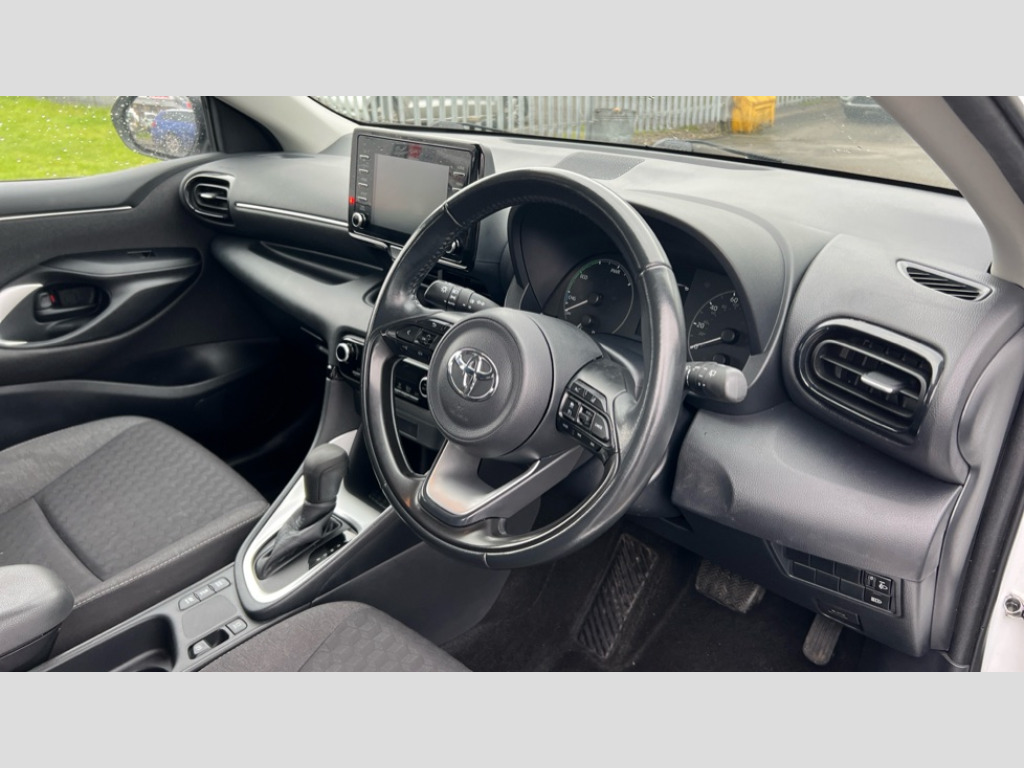 Toyota Yaris 1.5 Hybrid Icon 5dr CVT 4.2" coloured TFT multi information display with analogue speedometer, Adaptive cruise control, Adjustable speed limit with speed warning, Bluetooth connectivity, E-call, Electric power steering, Hybrid energy display, Multi information display switches on steering wheel, Reversing camera, Smartphone integration with Apple CarPlay and Android auto, Tailgate, Voice recognition, Vehicle Stability Control (VSC), 4 speakers, 7" Multimedia display touch screen, Toyota Touch 2 with DAB, USB connection, Acoustic windscreen glass, Auto windscreen wipers, Automatic headlights, Body coloured door mirrors, Bulb indicators, Chequered front grille, Daytime running lights, Electric adjustable heated door mirrors, Follow me home headlights, Front auto power windows with anti jam protection, Halogen projector headlights, LED High mounted stop lamp, Manual headlight levelling, Rain sensor, Rear side wing doors, Rear spoiler, Rear wiper, Shark fin antenna, Turning signal integrated indicators in door mirrors, Variable front intermittent wipers, 3 adjustable rear headrests, 3 spoke leather steering wheel, 60/40 split folding rear seat, Active headrests, Adjustable boot height, Auto air conditioning, Coat hooks in rear grab handles, Cup holders (2 front & door), Data Communication Module (DCM) connected services, Fabric upholstery, Front armrest, Glovebox, Grey roof lining, Height adjustable driver's seat, Isofix seat fixing, Leather gearshift, Pollen filter, Shopping bag hooks, Single front passenger seat, Tilt/telescopic steering column, 3 point seatbelts on all rear seats, ABS+EBD+Brake assist, Electronic parking brake, Emergency brake light system (EBS), Front passenger airbag on/off switch, Front seatbelt reminder, Hill start assist control (HAC), Rear child proof door locks, Rear seat belt reminder, Supplemental Restraint System (SRS) 8 airbags: Driver & passenger's airbags, dual side curtain airbags, side impact airbags, front centre airbag, Toyota Safety Sense 2, Precollison + Night time Pedestrian & Cyclist Detection, Lane Trace Assist, Auto High Beam, Intelligent ACC & Road Sign Assist, Tyre pressure warning system, 2x Master key, Alarm/immobiliser, Remote powered central double locking doors, Soft touch instrument panel, Space saver spare wheel