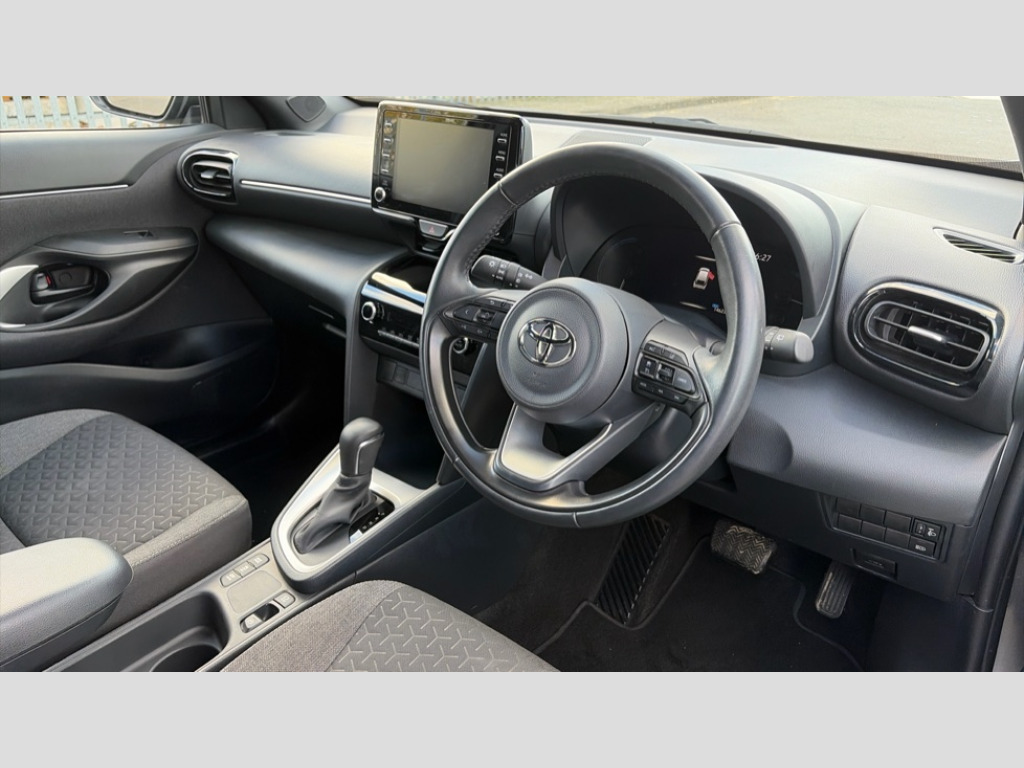 Toyota Yaris Cross 1.5 Hybrid Design 5dr CVT 7" Multi information display screen, 8" Toyota touch 2 multimedia system with Smartphone integration with Apple CarPlay and Android auto, Adjustable speed limiter, Bluetooth connectivity, Driver attention alert system, eCall emergency system, Electric power steering, Full range intelligent adaptive cruise control, Hybrid system indicator, Key reminder warning, Lane trace assist, Multimedia, audio, telephone and voice recognition switches on steering wheel, My T Connected services, Pre-collision system enhanced with emergency steering assist, Reversing camera, Road sign assist - RSA, Steering assisted vehicle stability control, 6 speakers, DAB Digital radio, USB connection, 3rd brake light, Acoustic windscreen glass, Aluminium roof rails, Anti-jam protection on power windows, Auto high beam [AHB] with on/off switch, Automatic headlights, Black lower front grille, Black Shark-fin antenna, Black upper front grille, Black wheel arch mouldings, Body colour door handles, Body colour front bumper, Body colour rear bumper, Electric adjustable heated door mirrors, Follow me home headlights, Front and rear electric windows with auto up/down function, Front intermittent wipers, Headlight cut off reminder, Indicators integrated on door mirrors, Intermittent rear wiper, LED daytime running lights guide, LED front fog lights, LED front light guide, LED Indicators, LED projector headlights, LED rear light guide, Manual headlight levelling, Manually retractable door mirrors, Noise reduction layer on windscreen, Privacy glass, Rain sensor, Rear LED lights with sequential indicators, Rear side wing doors, Rear spoiler, Rear window defogger, 12v power outlet - front, 2x Rear coat hooks, 3 seat bench in 2nd row, 3 spoke leather steering wheel, 40:20:40 split folding rear bench seat, Adjustable speed limiter switch on steering wheel, Auto air conditioning, Black roof lining, Boot light, Central armrest, Centre console in light blue ambent lighting, Driver and front passenger personal lights, Fabric door trim, Fabric upholstery, Footwell in light blue ambient lighting, Front console box, Front cup holders, Front head restraints, Glovebox, Height adjustable driver's seat, Height adjustable front passenger seat, Hooks for luggage holding belts, ISOFIX child restraint system, Lane departure alert switch on steering control, Leather gearshift, Light blue ambient lighting on front doors, Manual telescopic and tilting steering wheel, Mirror on driver and passenger sun visor, Pollen air filter, Rear cup holders, Rear head restraints, Single front passenger seat, Soft tonneau cover, 3x3 point rear seat belts, ABS+EBD+Brake assist, Driver and passenger central airbags, Driver and passenger front airbags, Driver and passenger side airbags, Electronic parking brake, Emergency brake light system (EBS), Front seat belt reminder, Hill start assist control (HAC), Passenger airbag on/off switch, Pre-collision system with pedestrian and cyclist detection, Rear door child safety locks, Rear passenger side airbags, Rear seat belt reminder, Traction control, Tyre pressure warning system, Immobiliser, Intrusion alarm, Keyless smart entry with push button start, Power door locks, Power passenger window lock, Remote door lock, Tyre repair kit