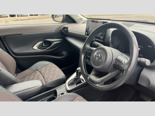 Toyota Yaris Cross 1.5 Hybrid Excel 5dr CVT 7" Multi information display screen, Adjustable speed limiter, Bluetooth connectivity, Driver attention alert system, eCall emergency system, Electric power steering, Full range intelligent adaptive cruise control, Hybrid system indicator, Key reminder warning, Lane trace assist, Multimedia, audio, telephone and voice recognition switches on steering wheel, My T Connected services, Pre-collision system enhanced with emergency steering assist, Reversing camera, Road sign assist - RSA, Steering assisted vehicle stability control, 6 speakers, DAB Digital radio, USB connection, 3rd brake light, Acoustic windscreen glass, Aluminium roof rails, Anti-jam protection on power windows, Auto high beam [AHB] with on/off switch, Automatic headlights, Automatically retractable door mirrors, Black lower front grille, Black Shark-fin antenna, Black wheel arch mouldings, Body colour door handles, Body colour front bumper, Body colour rear bumper, Dark chrome plated insert on upper front grille, Electric adjustable heated door mirrors, Electrochromatic auto dimming rear view mirror, Follow me home headlights, Front and rear electric windows with auto up/down function, Front intermittent wipers, Gloss black upper front grille, Headlight cut off reminder, Indicators integrated on door mirrors, Intermittent rear wiper, Kick activated power back door, LED daytime running lights guide, LED front fog lights, LED front light guide, LED Indicators, LED projector headlights, LED rear light guide, Manual headlight levelling, Noise reduction layer on windscreen, Privacy glass, Rain sensor, Rear LED lights with sequential indicators, Rear side wing doors, Rear spoiler, Rear window defogger, 12v power outlet - front, 12V power point in boot, 2x Rear coat hooks, 3 seat bench in 2nd row, 3 spoke leather steering wheel, 40:20:40 split folding rear bench seat, Adjustable speed limiter switch on steering wheel, Boot light, Central armrest, Centre console in light blue ambent lighting, Driver and front passenger personal lights, Driver and passenger seatback pockets, Dual zone automatic air conditioning, Fabric door trim, Fabric seat with synthetic leather upholstery, Footwell in light blue ambient lighting, Front console box, Front cup holders, Front head restraints, Front sport seats, Glovebox, Grey roof lining, Heated driver and passenger seats, Heated steering wheel, Height adjustable driver's seat, Height adjustable front passenger seat, Hooks for luggage holding belts, ISOFIX child restraint system, Lane departure alert switch on steering control, Leather gearshift, Light blue ambient lighting on front doors, Light on driver and front passenger sun visor, Manual telescopic and tilting steering wheel, Mirror on driver and passenger sun visor, Nanoe-X air purifier, Pollen air filter, Power adjustable lumbar support on driver seat, Rear cup holders, Rear head restraints, Single front passenger seat, Soft tonneau cover, Storage box under boot floor, Advance safety pack - Yaris Cross, Tech pack - Yaris Cross, 3x3 point rear seat belts, ABS+EBD+Brake assist, Driver and passenger central airbags, Driver and passenger front airbags, Driver and passenger side airbags, Electronic parking brake, Emergency brake light system (EBS), Front seat belt reminder, Hill start assist control (HAC), Passenger airbag on/off switch, Pre-collision system with pedestrian and cyclist detection, Rear door child safety locks, Rear passenger side airbags, Rear seat belt reminder, Traction control, Tyre pressure warning system, Immobiliser, Intrusion alarm, Keyless smart entry with push button start, Power door locks, Power passenger window lock, Remote door lock, Tyre repair kit