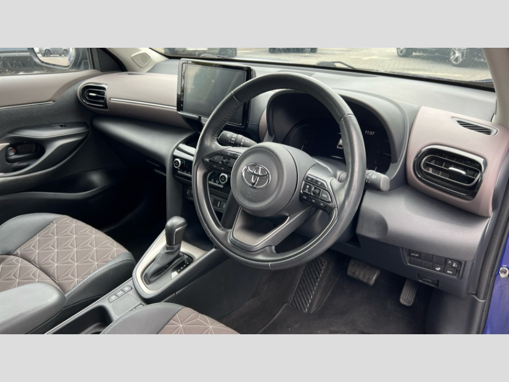 Toyota Yaris Cross 1.5 Hybrid Excel 5dr CVT Blind spot monitoring, Bluetooth connectivity, Driver attention alert system, eCall emergency system, Electric power steering, Front and rear parking sensors with intelligent clearance sonar and automatic braking, Full range intelligent adaptive cruise control, Lane trace assist, Multimedia, audio, telephone and voice recognition switches on steering wheel, My T Connected services, Pre-collision system enhanced with emergency steering assist, Rear cross traffic alert with brake assist, Reversing camera, Road sign assist - RSA, Vehicle Stability Control (VSC), 6 speakers, DAB Digital radio, USB connection, 3rd brake light, Acoustic windscreen glass, Aluminium roof rails, Auto high beam [AHB] with on/off switch, Auto windscreen wipers, Automatic headlights, Automatically retractable door mirrors, Black Shark-fin antenna, Body colour door handles, Body colour rear bumper, Dark chrome plated insert on upper front grille, Electric adjustable heated door mirrors, Electrochromatic auto dimming rear view mirror, Follow me home headlights, Front and rear electric windows with auto up/down function, Front auto power windows with anti jam protection, Gloss black upper front grille, Kick activated power back door, LED daytime running lights guide, LED front fog lights, LED front light guide, LED projector headlights, LED rear light guide, Privacy glass, Rain sensor, Rear auto power windows with anti jam protection, Rear LED lights with sequential indicators, Rear side wing doors, Rear wiper, 12v power outlet - front, 12V power point in boot, 2x Rear coat hooks, 3 seat bench in 2nd row, 3 spoke leather steering wheel, 40:20:40 split folding rear bench seat, Centre console in light blue ambent lighting, Driver and passenger seatback pockets, Dual zone automatic air conditioning, Fabric seat with synthetic leather upholstery, Footwell in light blue ambient lighting, Front console box, Front cup holders, Front head restraints, Glovebox, Grey roof lining, Heated driver and passenger seats, Heated steering wheel, Height adjustable driver's seat, Height adjustable front passenger seat, Hooks for luggage holding belts, Leather gearshift, Light blue ambient lighting on front doors, Light on driver and front passenger sun visor, Manual telescopic and tilting steering wheel, Mirror on driver and passenger sun visor, Power adjustable lumbar support on driver seat, Rear cup holders, Rear head restraints, Single front passenger seat, Soft tonneau cover, Storage box under boot floor, Tech pack - Yaris Cross, 3x3 point rear seat belts, ABS+EBD+Brake assist, Driver and passenger central airbags, Driver and passenger front airbags, Driver and passenger side airbags, Electronic parking brake, Emergency brake light system (EBS), Pre-collision system with pedestrian and cyclist detection, Rear door child safety locks, Rear passenger side airbags, Supplemental Restraint System (SRS) 8 airbags: Driver & passenger's airbags, dual side curtain airbags, side impact airbags, front centre airbag, Traction control, Tyre pressure warning system, Keyless smart entry with push button start, Tyre repair kit