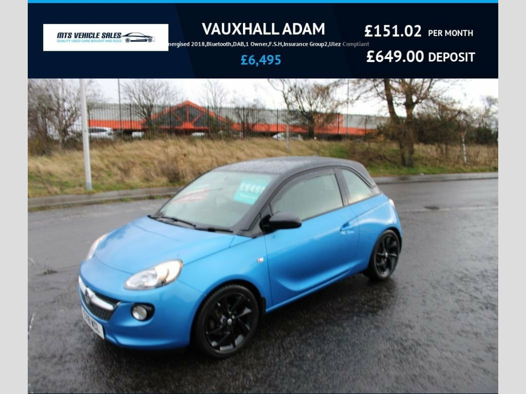Very Clean Example of this 1 Owner Vauxhall Adam,This Energised Edition Comes with Half Leather Interior, 17*Gloss Black Alloy Wheels,Electric Windows,Remote Central(2 keys) Air Con,Cruise Control,Bluetooth,DAB Radio,Rear Parking Sensors,Finished in Arden Blue Metalic with Black Roof&Mirror Caps,Spotless Condition Inside&Out,Excellent Driving Car,Full Service History,Very Economical returns Average 55mpg Only Group 2 Insurance,Ideal First Car,Ulez Compliant 12v Auxiliary Power Socket within Centre, 17in Alloy Wheels - Hurricane - Gloss Bl, ABS - Anti-Lock Braking System, Adaptive Brake Lights, Air Blend Heater, Air Conditioning with Four-speed Fan, Air Recirculation with Activation Light, Airbag - Drivers, Airbags - Front Passenger, Airbags - Front Seat Side-Impact, Anti-Submarining Ramps in Front Seats, Black B-Pillars, Black Jack Roof Colour Pack, Bluetooth Mobile Phone Portal, Body-Colour Door Handles, CBC - Cornering Brake Control, Chrome Effect Interior Door Handles, City Mode Button - Provides Lighter Stee, Collapsible Windscreen Wiper System, Colour Keyed Fleece Velour Carpet, Cruise Control with Speed Limiter, DAB Digital Radio, Dark Ti