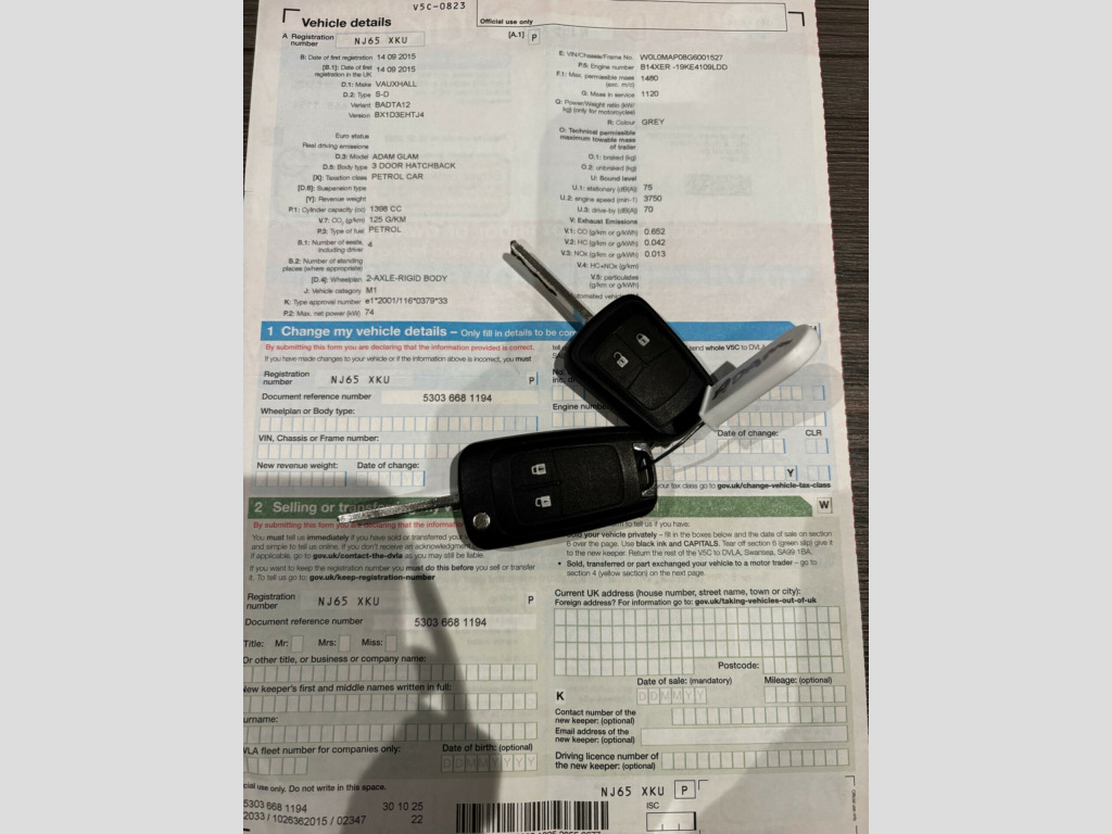Discover this exceptional 2015 Vauxhall ADAM GLAM, boasting remarkably low mileage for its age at just 45,110 miles.New front brake disc&pads fitted. This stylish city car is powered by a responsive 1.4L petrol engine and features a fixed glass panel roof with a sliding blind, offering a panoramic sunroof experience. Stay connected on the go with the integrated mobile phone system, complete with Bluetooth connectivity, and enjoy consistent comfort thanks to the electronic climate control.This Vauxhall ADAM GLAM stands out with its low insurance group, making it an economical choice for many drivers. The combination of its attractive GLAM trim, the desirable fixed glass roof, and the convenience of Bluetooth and climate control, all presented with very low mileage, signifies a vehicle that has been well cared for and offers excellent value compared to other similar models on the market.. 12V Power Socket, 16in Alloy Wheels - Vintage In Silver, ABS - Anti-Lock Braking System, Air Recirculation System, Airbags - Deactivation Switch For Front Passengers, Airbags - Front Curtain, Airbags - Front Passenger, Airbags - Side Impact, Aux in Socket, Black B-Pillars, Body-Colour Door Handles with Chrome-Effect Insert, Brake Lights - Adaptive, Bumpers - Body Coloured, CBC - Cornering Brake Control, CD Player - with MP3 Compatability, Chrome Effect Interior Door Handles, Chrome Effect Side Window Mouldings, City Mode Button - Provides Lighter Steering at Parking Speeds, Climate Control - ECC - Electronic, Cruise Control with Speed Limiter, DAB Digital Radio, Daytime Running Lights - LED, Door Mirrors - Body Colour, Door Mirrors - Electrically Adjustable-Heated, Door Pockets, Door Sills - Chrome Effect Front, Drinks Holder - x2 Rear Centre Console, Drinks Holder in Centre Console, Drivers Dual-Stage Airbag, EBA - Emergency Brake Assist, EBD - Electronic Brakeforce Distribution, ESP - Electronic Stability Programme, Electric Windows - Front with One Touch Facility, Exterior Light Pack, Front Passengers Seat Height Adjuster, Glovebox - Illuminated, Grab Handles - Front, HSA - Hill Start Assist, Height Adjustable Front and Rear Headrests, ISOFIX For Outer Rear Seats, Illuminated Boot, Immobiliser, Interior Pollen Filter, Load Compartment - Cover, Locking Wheel Nuts, Mobile Phone System with Bluetooth Connectivity, PAS - Power Assisted Steering, Pedal Release System, RDS - Radio Data-Traffic System, Remote Central Locking, Roof - Body Colour, Roof - Fixed Glass Panel with Sliding Blind, Seatbelt Unfastened Warning, Seats - 50-50 Split Rear Back, Seats - Drivers Height Adjustment, Speakers - x7, Speed Limiter, Steering Column - Energy Absorbing, Steering Wheel - Height-Reach Adjustable, Steering Wheel - Leather, Steering Wheel - Mounted Controls For Audio, Straight Line Stability Control, Sunvisors - Driver and Passenger with Vanity Mirrors, Tail Lights - LED, Tinted Glass, Traction Control, Trip Computer, Tyre Inflation Kit, Tyre Pressure Monitoring System, USB Connection with iPod Control. Full service history