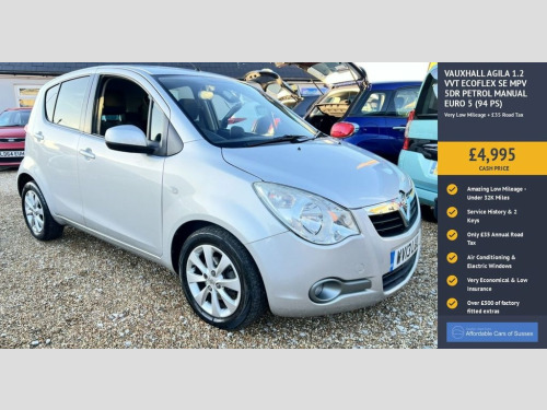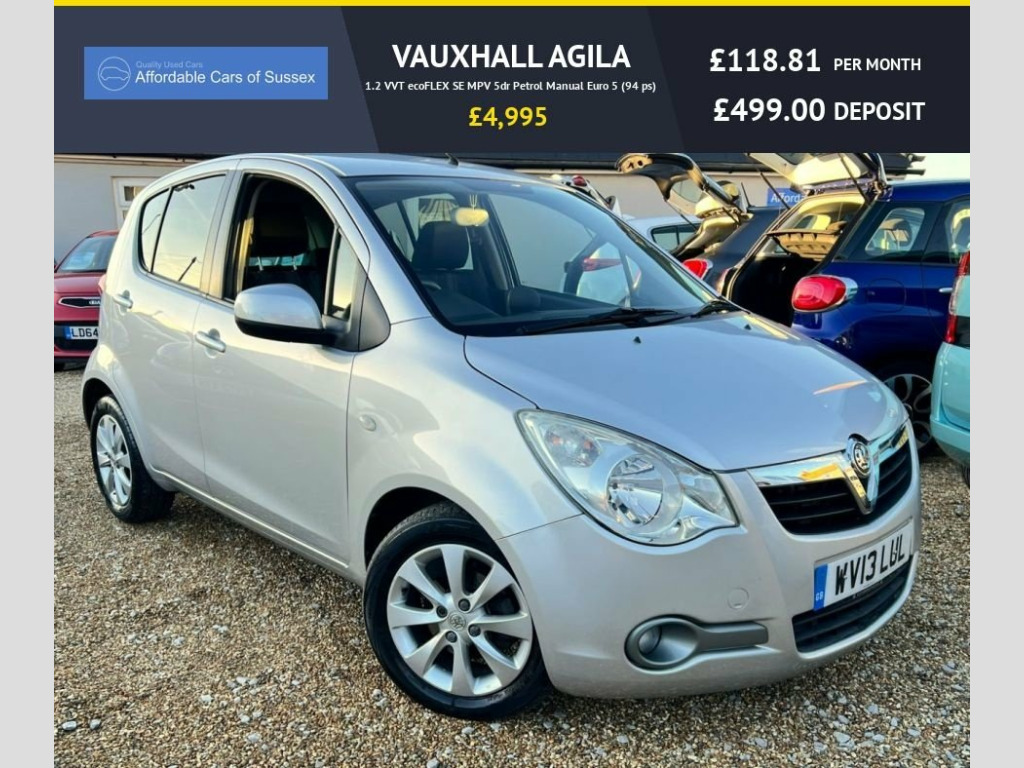 This 2013 Vauxhall Agila 1.2 VVT ecoFLEX SE MPV 5dr Petrol Manual Euro 5 (9 MPV is currently available for £4,995 in Peacehaven East Sussex with Petrol engine and Manual gearbox. For more information or to arrange a viewing, click here to send us an email using form below.