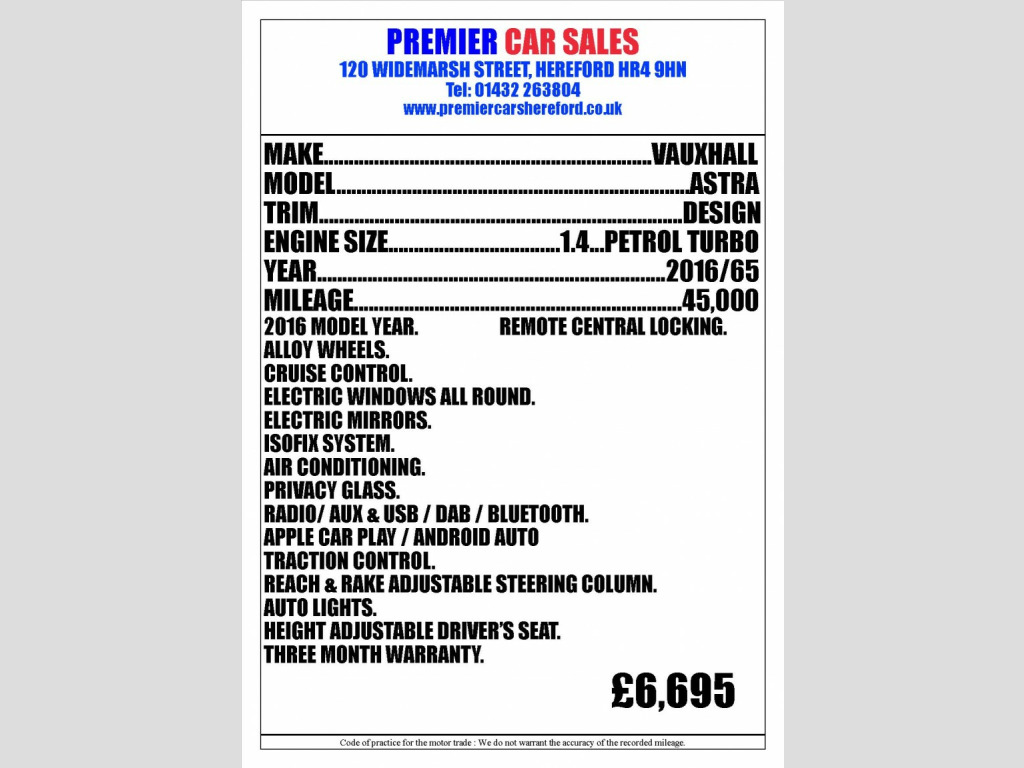 This 2016 Vauxhall Astra 1.4 i Turbo Design Hatchback is currently available for £6,695 in Hereford Herefordshire with Petrol engine and Manual gearbox. For more information or to arrange a viewing, click here to send us an email using form below.