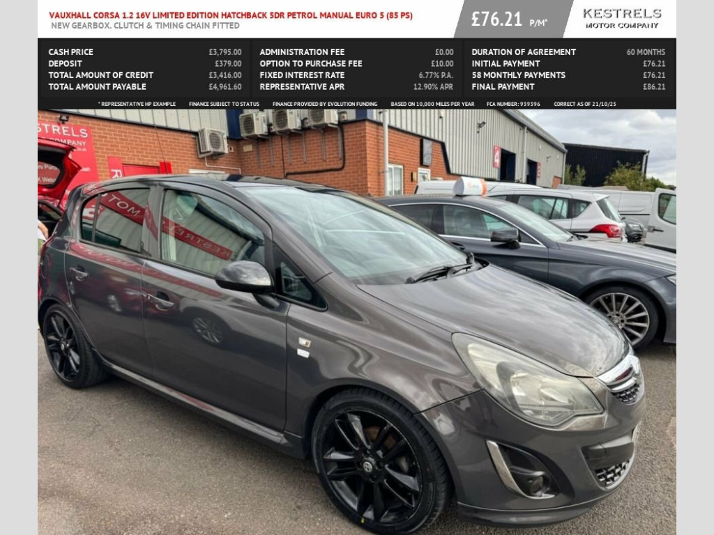 This 2014 Vauxhall Corsa Limited Edition has a remarkably low mileage for its age having covered just 59,798 miles. This particular example boasts a full service history, with its most recent service completed on 11th November 2024 at 59,738 miles, and comes with a clear vehicle history check for your peace of mind. The 1.2 litre petrol engine is paired with a 3 month warranty & new MOT. Inside, you'll find practical features such as rear door pockets and air conditioning, alongside the convenience of easy entry front seats with memory function. The Corsa Limited Edition is also noted for its low insurance group, making it an economical choice for many drivers. These highlights, combined with its well maintained provenance and desirable features, suggest this Vauxhall Corsa offers a superior ownership experience compared to other vehicles of its kind. £3000 recently spent on servicing, new gearbox, clutch, timing belt etc all documented. Part exchange welcome, finance arranged. 12V Power Socket - Front, 17in Alloy Wheels - Black, ABS - Anti Lock Brakes, Adjustable Speed Limit Audible Warning, Air Conditioning, Air Vents - Colour Keyed to Body Colour, Air Vents - Matt Chrome Effect, Airbags - Passenger, Airbags - Passenger Deactivation, Anti-Submarining Ramps in Seats, Asteroid Grey, Black Carbon Flash Roof, Brake Lights - Adaptive, Bumpers - Body Coloured, CBC - Cornering Brake Control, Centre Storage with Two Cup Holders, Chrome-Style Dual Ellipsoidal Halogen He, Cruise Control, Daytime Running Lights, Door Handles - Body Coloured, Door Sills - Body Coloured, Drivers Airbag, Drivers Seatbelt Unfastened Audible Warn, Easy-Entry Front Seats with Memory, EBD - Electr