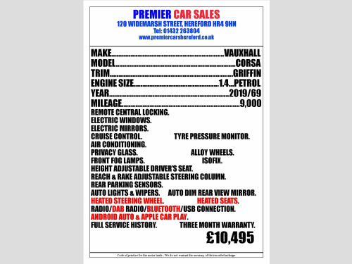 This 2019 Vauxhall Corsa 1.4 i ecoTEC Griffin Hatchback is currently available for £10,495 in Hereford Herefordshire with Petrol engine and Manual gearbox. For more information or to arrange a viewing, click here to send us an email using form below.
