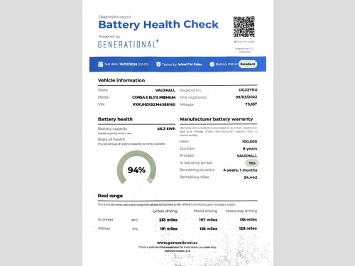 THIS 2022 VAUXHALL CORSA ELECTRIC ELITE PREMIUM BOASTS A FULL DEALERSHIP SERVICE HISTORY, OFFERING PEACE OF MIND FOR ITS NEXT OWNER. THIS ELECTRIC MODEL FEATURES A 50 KWH BATTERY, PROVIDING A MAXIMUM RANGE OF 222 MILES WHEN NEW. RAPID PUBLIC CHARGING CAN REPLENISH THE BATTERY FROM EMPTY TO 80% IN JUST 55 MINUTES. NOTABLE FEATURES INCLUDE INTELLILUX LED MATRIX HEADLIGHTS, A HEATED STEERING WHEEL FOR COMFORT, AND A PANORAMIC REAR VIEW CAMERA FOR ENHANCED PARKING ASSISTANCE. THE MULTIMEDIA NAVI PRO SYSTEM SEAMLESSLY INTEGRATES ANDROID AUTO AND APPLE CARPLAY, WITH BLUETOOTH CONNECTIVITY ALSO INCLUDED. THE CORSA ELECTRIC ELITE PREMIUM STANDS OUT WITH ITS ADVANCED TECHNOLOGY AND PRACTICAL ELECTRIC PERFORMANCE. THE AUTOMATIC LIGHTING CONTROL ENSURES OPTIMAL VISIBILITY, WHILE THE COMBINATION OF ANDROID AUTO AND APPLE CARPLAY WITHIN THE MULTIMEDIA NAVI PRO SYSTEM OFFERS A CONNECTED AND CONVENIENT DRIVING EXPERIENCE. THESE FEATURES, ALONGSIDE THE IMPRESSIVE CHARGING CAPABILITIES AND COMPREHENSIVE SERVICE HISTORY, HIGHLIGHT HOW THIS VAUXHALL CORSA ELECTRIC OFFERS A SUPERIOR AND WELL MAINTAINED OPTION FOR THOSE SEEKING AN ELECTRIC VEHICLE. 12V Electrical Accessory Socket, 17in Alloy Wheels - Bi-Colour, 7in Digital Instrument Cluster, ABS - Anti-Lock Braking System, Airbag - Drivers, Airbags - Front Passenger, Airbags - Front Seat Side-Impact, Airbags - Full Size Curtain, Automatic Anti-Dazzle Rear-View Mirror, Automatic Emergency City Braking, Automatic Headlight Levelling System, Automatic Lighting Control, Black Roof and A-Pillars, Body Coloured Front and Rear Bumpers, Bonnet - Headlight - Wiper Structure, Cabin Particulate Filter, Central Facia Display, Centre Rear Brake Light, Child Proof Locks on Rear Doors, Chrome Effect Lower Side Window Trim, Chrome Logo Bar, Comfort Front Seats, Cruise Control with Speed Limiter, Dark