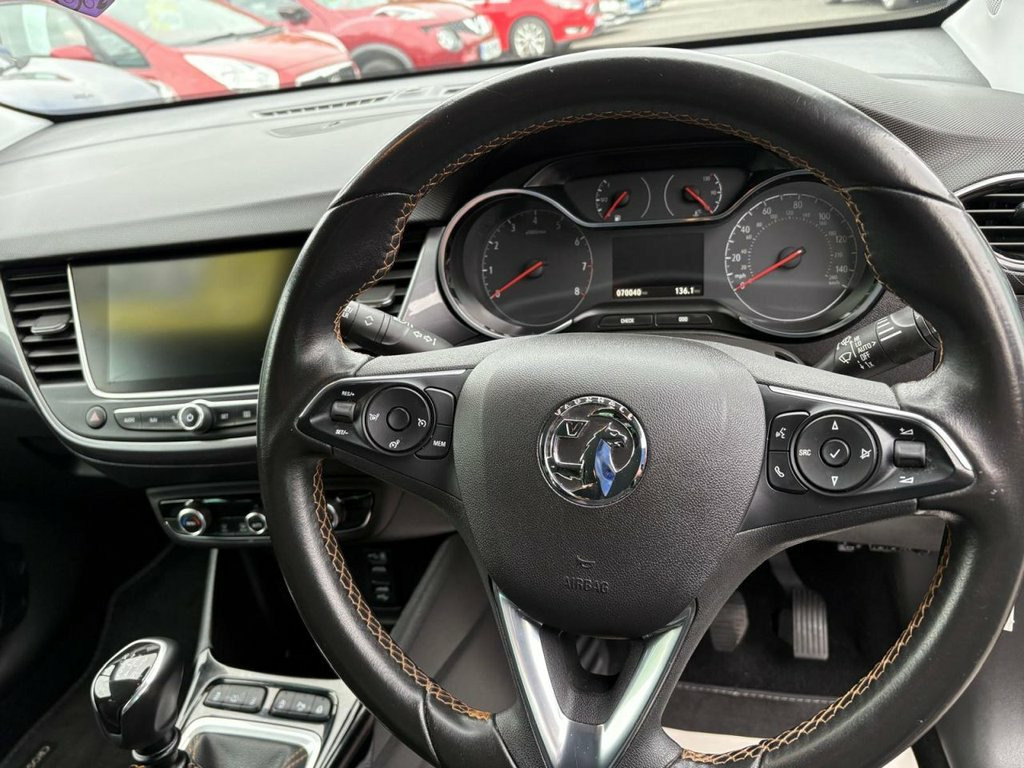 Vauxhall Crossland X Turbo GPF in metallic black with service history. Comes with sat navigation, 17" alloy wheels, air conditioning, electric windows in the front and rear, electric mirrors., rear parking sensors, cruise control, half leather trim, auto lights and wipers, rear privacy glass, heated front screen, its a 6 speed, has lane assist, stop/start engine, bluetooth, voice command, a touchscreen dab radio, aux port, usb, multifunction steering wheel and 2 remote keys. THE CAR WILL HAVE A SERVICE AND 12 MONTHS MOT / PART EXCHANGE IS ALWAYS WELCOME / FREE 12 MONTH AA ROADSIDE RECOVERY INCLUDED / FINANCE IS AVAILABLE VIA OUR WEBSITE LINK / THE CAR HAS BEEN HPI AND MILEAGE CHECKED, ALL OK / WE ARE A FAMILY RUN BUSINESS AND HAVE BEEN TRADING FOR OVER 30 YEARS, WE OFFER DELIVERY IN MAINLAND UK (Please ask for details), WE ARE HERE TO HELP YOU! PLEASE CONTACT US WITH ANY QUESTIONS 12V Electrical Accessory Socket, 17in Alloy Wheels - Diamond-Cut Technica, ABS - Anti-Lock Braking System, Airbags - Front Seat Side-Impact, Alloy Effect Protective Front and Rear S, Ambient Facia - Centre Console Downlight, Ambient LED Lighting in Front Doors - Fa, Anti-Submarining Ramps in Front Seats, Automatic Lighting Control, Black Door Panels with Medium Grey Premi, Body Colour Roof and Door Mirrors, Body Coloured Door Handles, Central Facia Display, Child Proof Locks on Rear Doors, Chrome Effect Front Grille Bar, Chrome Effect Interior Door Handles, Chrome Effect Side Window Trim, Collapsible Windscreen Wiper System, Comfort Front Seats, Cruise Control with Speed Limiter and In, CSC