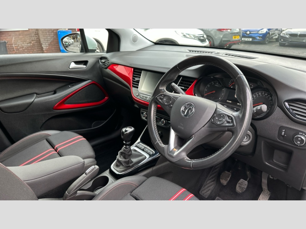 Vauxhall Crossland 1.2 Turbo [130] SRi Nav 5dr 3.5" monochrome instrument colour display, Audible lights on warning, Bluetooth connectivity, Cruise control + speed limiter, Digital clock with automatic RDS time adjustment, eCall emergency call system, Instrumentation - Speedometer, rev counter, low fuel gauge warning light + water temperature gauge warning light, shift up/down indicate light, Lane departure warning system, Multi function trip computer, Multimedia sat nav pro with 8" colour touchscreen, AM/FM, Bluetooth streaming, Bluetooth mobile phone portal, apple CarPlay/Android Auto + 6 speakers, Outside temperature display with ice warning, Rear parking distance sensors, Refridgerant low indicator, Service interval indicator, Speed sensitive power steering, Speed sign recognition, Front wheel drive, 2 x USB connections, DAB Digital radio, Steering wheel mounted audio/phone/cruise controls, 2 speed wipers/wash wipe/intermittent wipe, 3rd brake light, Alloy effect front and rear skid plates, Automatic anti dazzle rear view mirror, Automatic headlamp levelling system, Automatic high beam control with cornering light, Automatic lighting control, Black radiator grille with chrome bar, Body colour door handles, Body colour front and rear bumpers, Dark tinted rear side windows + tailgate window, Electrically adjustable and heated door mirrors, Front power windows with express up/down and anti-pinch function, Hazard warning lights, Headlamps for left side traffic, Heated rear window, Integrated tailgate spoiler, Intermittent rear wash/wipe, LED daytime running lights, LED front fog lights, LED Headlights, LED side repeat indicators, Rain sensitive windscreen wipers, Rear fog lights, Rear power windows with express up/down and anti-pinch function, Rear side wing doors, Rear wing door, Reversing light, Side window demist vents, Silver roof rails, Solar heat absorbing windscreen and windows, Welcome lighting, Windscreen demist vents, Without LED rear lights, 12v power outlet - front, 12V power outlets on rear seat, 2 way front passive headrests, 3 seat bench in 2nd row, 3 spoke flat bottomed leather covered steering wheel with bezel decoration, 4 way electrically adjustable lumbar support for drivers seat, 4 way electrically adjustable lumbar support for front passenger seat, Adjustable rear seat backrest, Air recirculation facility, Ambient lighting, Anti submarining ramps in front seats, Banda cloth/vinyl upholstery, Cabin particulate filter - removes dust, airborne particles and pollen, Driver and front passenger illuminated vanity mirrors with flip up covers, Dual zone electronic climate control, Ergonomic active front seats with 8 way manual adjustable driver and front passenger seats with height, reach, and backrest, Fade up/fade down on interior lighting, Four adjustable facia vents, Front door pockets with bottle holders, Front map reading lights, Front passenger seat, Fully carpeted luggage area, Glovebox with lid, Height adjustable front/rear head restraints, Illuminated load area, Interior courtesy light operated by all doors, Isofix system on outer rear seats, Jet black premium leather side bolsters, Luggage compartment cover, Multi-speed fan with Illuminated control, Open storage compartment in centre console, Passenger assist handles, Reach + rake adjustable steering column, Rear door pockets with bottle holders, Rear floor ventilation ducts, Rear reading lights, Satin chrome effect bezel on steering wheel, Seat cushion extension, Sliding 60/40 rear seat with centre rear seat armrest, Storage pockets on front seat backs, Two drinks holders in centre console, Uplevel centre console front centre armrest with storage, Versatility pack - Crossland, 3x3 point rear seatbelts, 6 airbags - Driver and co-driver front, front side, head curtain roof airbags, front and rear row coverage airbags, ABS, Child locks on rear doors, CSC - Cornering stability control, Deactivate switch for side impact airbags, Deformation zones front and rear, Dual seatbelt pretensioners on front seats, EBD - Electronic brakeforce distribution, Energy absorbing steering column, Engine drag torque control, ESP + traction control, Front and rear seatbelt unfastened audible warning and warning light, Front side impact airbag, Hill start assist, Hydraulic Brake Assist (HBA), Hydraulic brake boost, Inertia reel lap and diagonal seatbelts for all seats, Passenger airbag deactivate switch, Rear seat belt pretensioners, Reinforced passenger safety cell, Seatbelt load limiter, Side impact protection beams, Smart seatbelt reminder for front and rear seats, Tyre pressure monitoring system, 2 remote folding keys, Electronically protected audio equipment, Engine immobiliser, Locking wheel nuts, Remote central deadlocking, Remote control central locking activation switch on driver door, Remote control central locking operates on doors, tailgate and fuel filler flap, Remote security alarm system, Visible vehicle identification number, Black facia with red trim insert, Cluster black with printed rings, Red trim inserts on front doors