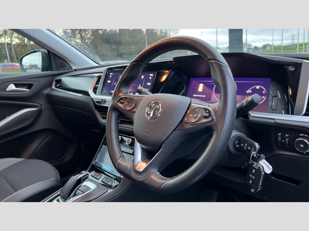Vauxhall Grandland 1.2 Turbo GS Line 5dr Auto 12" colour digital cluster, 180 degree rear view camera, Central facia display with digital clock, outside air temperature and audio information, Cruise control with speed limiter, Digital fuel gauge with low fuel level warning light, Digital rev counter, Digital speedometer, Digital water temperature gauge with warning light, Driver drowsiness alert system, Driver information - Total mileage, service indicator, oil life, Gearshift up/down indication light, Lane departure warning system, Lane keep assist, Lights on audible warning, Multi function trip computer - Trip odometer, vehicle range, average speed and fuel economy, instantaneous fuel economy and driving time, Multimedia navi pro with 10" colour touch+ sat nav+AM/FM/DAB radio, bluetooth audio streaming/mobile phone portal, Apple carplay/Android auto, USB, Speed sensitive electric power assisted steering, Speed sign recognition, Vauxhall connect including Ecall and connected services, Six speaker - four front + two rear, Steering wheel mounted audio/phone/cruise controls, 3rd brake light, Automatic lighting control, Automatically dimming anti dazzle rear view mirror, Black door mirrors, Black side window trim, Body colour door handles, Carbon black door claddings, Collapsible windscreen wipers, Dark tinted rear side and tailgate windows, Door mirror puddle light, Door to door illumination, Electrically adjustable and heated power door mirrors (wide-angle on drivers side) with automatic timed cut-off, Electrically operated front and rear windows with safety auto reverse and one touch up/down facility, Front/rear bumper and wheel arches in carbon black exterior color, GRANDLAND Carline name badge in - High gloss black, Hazard warning lights, Heated rear screen with timed cut off, High beam assist, High gloss black protective front and rear skid plates with C shape bumper inserts, High gloss black roof rails, High level centre rear brake light, Intermittent rear window wash/wipe, LED daytime running lights, LED Headlights, LED tail lights, Manual headlight beam levelling, Rain sensor windscreen wipers, Rear side wing doors, Rear spoiler, Reversing light, Shark fin aerial, Side protection mouldings, Side window demist vents, Soundproof insulated windscreen, Tinted windows, Upper and lower bumper design, Vauxhall brand griffin badge in front and rear in high gloss black, Vauxhall plate door sill cover, Vizor front grille, Welcome lighting, Windscreen demist vents, 12V electrical accessory socket in front, 3 bench rear seats in 2nd row, 3 spoke flat bottom leather steering wheel with satin chrome effect bezel, 4 way electric driver lumbar support, 4 way manual adjustable driver seats with height, reach and backrest, 60/40 split folding rear seat, Advanced predictive logic control system using a sun sensor, Alloy sports pedals, Ambient centre console downlighter, Anti submarining ramps in front seats, Automatic air direction and fan speed with manual override, Black premium leather-effect side bolsters, Charcoal filter, Chrome effect interior door handles, Cosmo 1 Harlekin curitiba seats, Covered storage compartment in centre console and in driver armrest, Driver ergonomic active front seat, Driver's centre armrest, Dual zone electronic climate control, Four adjustable facia vents, Front door pockets with 2.6 litre capacity, Front passenger seat, Front passenger seat cushion extension, Front passenger sport style seat, Grey headliner, Height adjustable headrests, Illuminated controls, Illuminated driver/passenger sunvisors, Illuminated luggage area + Ambient lighting in front doors, Interior courtesy light operated by door switches, ISOFIX on front passenger and rear outer seats, Luggage compartment cover, Reach + rake adjustable steering column, Rear centre seat head restraint, Rear door pockets with 1.8 litre capacity, Rear passenger compartment heating ducts, Rear reading lights, Two drinks holders in centre console, Ventilated glovebox with lid, 6 Airbags - Driver and passengers front airbag, two front side impact airbag, full size curtain airbags for driver, Anti-lock braking system (ABS), Automatic emergency braking system, Child proof locks on rear doors, CSC - Cornering stability control, Deactivation switch for front passenger front and side impact airbags, Deflation detection system, Deformation zones front and rear, Dual seatbelt pretensioners on front seats, EBD - Electronic brakeforce distribution, Electronic parking brake, Electronic stability program (ESP) including traction control, Energy absorbing steering column, Engine drag torque control, Hill start assist, Hydraulic Brake Assist (HBA), Inertia reel lap and diagonal seatbelts for all seats, Load limiters on outer rear seatbelt retractors, Rear restraint seat belt pretensioner, Reinforced passenger safety cell, Side impact protection beam, Smart seatbelt reminder for front and rear seats, Tyre pressure monitoring system, Deadlocking system, Electronically protected audio equipment, Engine deadlock immobiliser, Freewheeling door locks, Key left in ignition audible warning, Locking wheel nuts, One rigid one flap-key coloured, Remote control central locking activation switch on driver door, Remote control primary foldable and additional foldable key, Remote security alarm system, Self powered alarm horn, Single horn, Theft deterent body security content and electircal child lock system, Theft deterent electrical, Visible vehicle identification number, Black door panels with black premium leather effect inserts, Dax decor facia panel with palladium medium finish, 18" 5 twin spoke high gloss black alloy wheels, Tyre inflation kit