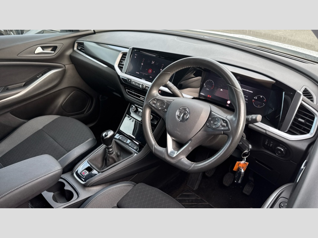 Vauxhall Grandland 1.2 Turbo SRi 5dr 12" colour digital cluster, Central facia display with digital clock, outside air temperature and audio information, Cruise control with speed limiter, Digital fuel gauge with low fuel level warning light, Digital rev counter, Digital speedometer, Digital water temperature gauge with warning light, Driver drowsiness alert system, Driver information - Total mileage, service indicator, oil life, Front and rear parking distance sensors with 180 degree rear view camera, Gearshift up/down indication light, Lane departure warning system, Lane keep assist, Lights on audible warning, Multi function trip computer - Trip odometer, vehicle range, average speed and fuel economy, instantaneous fuel economy and driving time, Multimedia navi pro with 10" colour touch+ sat nav+AM/FM/DAB radio, bluetooth audio streaming/mobile phone portal, Apple carplay/Android auto, USB, Speed sensitive electric power assisted steering, Speed sign recognition, Vauxhall connect including Ecall and connected services, Six speaker - four front + two rear, Steering wheel mounted audio/phone/cruise controls, 3rd brake light, Automatic lighting control, Automatically dimming anti dazzle rear view mirror, Black door mirrors, Black side window trim, Body colour door handles, Carcolor black exterior color door claddings, Collapsible windscreen wipers, Dark tinted rear side and tailgate windows, Door mirror puddle light, Door mirrors with auto dipping function in reverse gear, Door to door illumination, Electrically adjustable and heated power door mirrors (wide-angle on drivers side) with automatic timed cut-off, Electrically operated front and rear windows with safety auto reverse and one touch up/down facility, Front bumper, Rear bumper and wheel arches in Charcoal black exterior color, GRANDLAND Carline name badge in - High gloss black, Hazard warning lights, Heated rear screen with timed cut off, High beam assist, High gloss black roof rails, High level centre rear brake light, Intermittent rear window wash/wipe, LED daytime running lights, LED Headlights, LED tail lights, Manual headlight beam levelling, Rain sensor windscreen wipers, Rear side wing doors, Rear spoiler, Reversing light, Shark fin aerial, Side protection mouldings, Side window demist vents, Skidplate front & rear - High Gloss Black, High Gloss black or polished black C shapes Inserts, Soundproof insulated windscreen, Tinted windows, Upper and lower bumper design, Vauxhall brand griffin badge in front and rear in high gloss black, Vauxhall plate door sill cover, Vizor front grille, Welcome lighting, Windscreen demist vents, 12V electrical accessory socket in front, 3 bench rear seats in 2nd row, 3 spoke flat bottom leather steering wheel with satin chrome effect bezel, 4 way electric driver lumbar support, 4 way manual adjustable driver seats with height, reach and backrest, 60/40 split folding rear seat with centre rear seat armrest and load though facility, Advanced predictive logic control system using a sun sensor, Ambient centre console downlighter, Anti submarining ramps in front seats, Automatic air direction and fan speed with manual override, Black premium leather-effect side bolsters, Charcoal filter, Chrome effect interior door handles, Cosmo 1 Harlekin curitiba seats, Covered storage compartment in centre console and in driver armrest, Driver ergonomic active front seat, Driver's centre armrest, Dual zone electronic climate control, Four adjustable facia vents, Front door pockets with 2.6 litre capacity, Front passenger seat, Front passenger seat cushion extension, Front passenger sport style seat, Grey headliner, Height adjustable headrests, Illuminated controls, Illuminated driver/passenger sunvisors, Illuminated luggage area + Ambient lighting in front doors, Interior courtesy light operated by door switches, Isofix system on outer rear seats, Luggage compartment cover, Reach + rake adjustable steering column, Rear centre seat head restraint, Rear door pockets with 1.8 litre capacity, Rear passenger compartment heating ducts, Rear reading lights, Two drinks holders in centre console, Ventilated glovebox with lid, 6 Airbags - Driver and passengers front airbag, two front side impact airbag, full size curtain airbags for driver, Anti-lock braking system (ABS), Automatic emergency braking system, Child proof locks on rear doors, CSC - Cornering stability control, Deactivation switch for front passenger front and side impact airbags, Deflation detection system, Deformation zones front and rear, Dual seatbelt pretensioners on front seats, EBD - Electronic brakeforce distribution, Electronic parking brake, Electronic stability program (ESP) including traction control, Energy absorbing steering column, Engine drag torque control, Hill start assist, Hydraulic Brake Assist (HBA), Inertia reel lap and diagonal seatbelts for all seats, Load limiters on outer rear seatbelt retractors, Rear restraint seat belt pretensioner, Reinforced passenger safety cell, Side impact protection beam, Smart seatbelt reminder for front and rear seats, Tyre pressure monitoring system, Deadlocking system, Electronically protected audio equipment, Engine deadlock immobiliser, Freewheeling door locks, Key left in ignition audible warning, Locking wheel nuts, One rigid one flap-key coloured, Remote control central locking activation switch on driver door, Remote control primary foldable and additional foldable key, Remote security alarm system, Self powered alarm horn, Single horn, Theft deterent body security content and electircal child lock system, Theft deterent electrical, Visible vehicle identification number, Black door panels with black premium leather effect inserts, Dax decor facia panel with palladium medium finish, 18" 5 twin spoke high gloss black alloy wheels, Tyre inflation kit