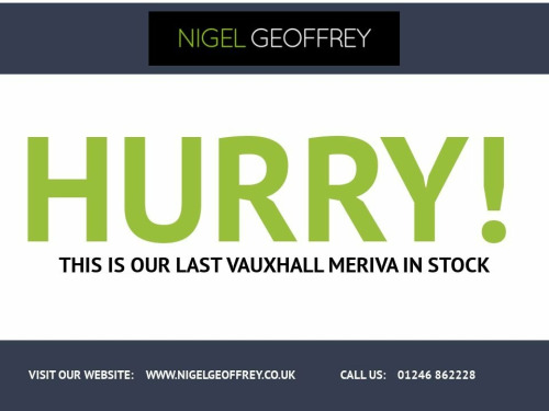 LOW MILEAGE ~ HARD TO FIND IN THIS CONDITION & WITH THIS MILEAGE ~ Viewing is highly recommended to appreciate the beautiful condition of this highly desirable and upgraded Vauxhall Meriva with the sought after 1.4 Petrol Engine ~ Documented Service History ~ Fantastic and highly sought after specification including: - Satellite Navigation ~ Bluetooth Telephone connectivity & Music Streaming ~ Rear Parking Sensors ~ USB and AUX Input ~ Dual Zone Climate Control ~ Automatic Headlights ~ Cruise Control and much more * * * * * * * * Nigel Geoffrey are pleased to offer for sale this stunning Meriva that has just been fully inspected for your peace of mind when purchasing this car. This Beautiful Meriva looks stunning in a fantastic colour combination . This car is in very nice condition inside and out and needs to be seen to really be appreciated. This car is 100% HPI clear. * * * * * * * * * * * * * * * * * * * 12V Power Socket - Front, 17in Alloy Wheels - 5 Spoke, 20 Watts Per Channel Output, ABS - Anti-Lock Braking System, Adaptive Brake Lights, Air Blend Heater with Six Speed Fan, Air Conditioning, Air Recirculation System, Airbags - Curtain, Airbags - Front Side Impact, Airbags - Passenger Deactivation, Airbags - Side Impact, Ambient Lighting - Mid Centre Console, Astor-Morrocana Cloth - Dark Galvanised , AUX Connection, Aviation Style Folding Trays on Front Se, Bottle Holders - Front, Brake Lights - Adaptive, Bumpers - Body Coloured, Burst-Proof Door Locks and Anti-Jam Door, CBC - Cornering Brake Control, Central Locking Switch in Centre Console, Child Proof Locks on Rear Doors, Chrome-Effect