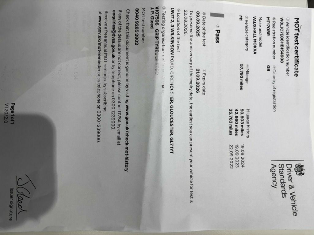 This 2017 Vauxhall Mokka X i Turbo Active boasts a clear vehicle history, MOT Sept 2026 4 New Tyres ,offering you peace of mind. Powered by a 1.4 litre petrol engine and meeting Euro 6 emissions standards, this Active trim model is a practical choice. Inside, you'll find the R4.0 IntelliLink system, complete with Android Auto and Apple Car Play for seamless smartphone integration, and Bluetooth connectivity. made easier with front and rear parking distance sensors, complemented by automatic lighting control for enhanced visibility. Enjoy a comfortable cabin environment thanks to the electronic climate control with air conditioning.This Vauxhall Mokka X is also in a low insurance group, which can help to keep your running costs down compared to similar vehicles. The inclusion of features like the touch screen infotainment system with smartphone mirroring and the parking assistance systems demonstrate a thoughtful specification that enhances the driving experience.. 12-Volt Electrical Accessory Socket, 12V Power Socket - Rear, 12v Auxiliary Power Socket Behind Front Seats, 18in Alloy Wheels - Silver Effect, 60-40 Split Flip and Fold Rear Seat, ABS - Anti-Lock Braking System, Adaptive Brake Lights, Airbag - Drivers, Airbags - Front Seat Side-Impact, Armrest - Front Centre, Automatic Lighting Control, Automatically Dimming Anti-Dazzle Rear-View Mirror, Black B-Pillars, Black Facia, Body Colour Door Mirrors, Body Side Protection Mouldings, Body-Colour Door Handles, Burst-Proof Door Locks and Anti-Jam Door Design, Central Facia Display, Child Proof Locks on Rear Doors, Chrome Effect Front Grille Bar, Chrome Effect Interior Door Handles, Collapsible Windscreen Wiper System, Comfort Front Seats, Cruise Control with Speed Limiter, Daytime Running Lights - LED, Deactivation Switch For Front Passengers Front and Side Impact Airbags, Deformation Zones Front and Rear, Door-to-Door Illumination, Driver Information Display, Drivers and Front Passengers Illuminated Vanity Mirrors with Flip-Up Cover, Drivers and Front Passengers Lap Belt Pretensioner System, EBD - Electronic Brakeforce Distribution, ESP - Switchable Electronic Stability Programme, Electrically Operated Front Windows with Safety Autoreverse and One-Touch Facility, Electrically Operated Rear Windows, Electronic Climate Control including Air Conditioning, Electronically Protected Audio Equipment, Emergency Brake Assist, Energy Absorbing Steering Column, Engine Deadlock Immobiliser, Exhaust Tailpipes - Stainless Steel, Fog Lights - Front, Foldable Luggage Area Cover, Four Adjustable Facia Vents, Front Body Lock Diagonal Seatbelt Pretensioner System, Front Door Pockets, Front Passenger Airbag, Front Passengers Underseat Storage Tray, Front Seatbelt Force Limiters, Front and Rear Parking Distance Sensors, Front and Rear Passengers Assist Handles, Front and Rear Seatbelt Unfastened Warning Light, Fuel Gauge with Low Fuel Warning Light, Full Size Curtain Airbags for Driver - Front Passenger and Outer Rear Seat Passengers, Fully Carpeted Luggage Area, HSA - Hill Start Assist, Halogen Headlights, Hazard Warning Lights, Head Restraints - Height Adjustable Outer Rear Seats, Headlights - High Beam Assist, Heated Rear Screen with Automatic Timed Cut-off, Height Adjustable Inertia-Reel Lap and Diagonal Seatbelts, Height-Adjustable Front Seat Head Restraints, High-Level LED Centre Rear Brake Light, ISOFIX Child Seat Restraint System for Outer Rear Seats Incorporating Top Tether, Illuminated Glovebox with Lid, Illuminated Luggage Area, Interior Courtesy Light Operated By Door Switches, Intermittent Rear Window Wash-Wipe, Laminated Windscreen, Lights On Audible Warning, Locking Wheel Nuts, Manual Headlight Beam Levelling, Multi-Function Trip Computer, Pedal Release System, R4.0 IntelliLink Touch-Screen Infotainment System, Rain Sensitive Windscreen Wipers, Rake and Reach Adjustable Steering, Rear Fog Light, Reinforced Passenger Safety Cell, Remote Control Central Locking, Remote Control Security Alarm System, Rev Counter, Reversing Lights, Roof Rails - Silver Effect, Side Impact Protection Beams, Side Window Demist Vents, Skid Plates - Protective Front Alloy Effect, Solar Heat Absorbing Windscreen, Speakers - x6, Speed Sensitive Power Assisted Steering, Speedometer, Steering Wheel - Mounted Audio Controls, Steering Wheel - Three-Spoke Design - Leather Covered - Satin Chrome-Effect Bezel, Storage Pockets on Front Seat Backs, TPMS - Tyre Pressure Monitoring System, Three Inertia-Reel Lap and Diagonal Rear Seatbelts, Tinted Windows, Twin Electrically Adjustable - Heated - Foldable Door Mirrors - Wide-Angle on Drivers Side with Automatic Timed Cut-Off, Two Drinks Holders in Front Centre Console, Two Speed Windscreen Wipers with Variable Intermittent Wipe, Upper and Lower Bumper Design, VIN - Visible Vehicle Identification Number, Vauxhall OnStar, Water Temperature Gauge with Warning Light, Windscreen Demist Vents. Full service history