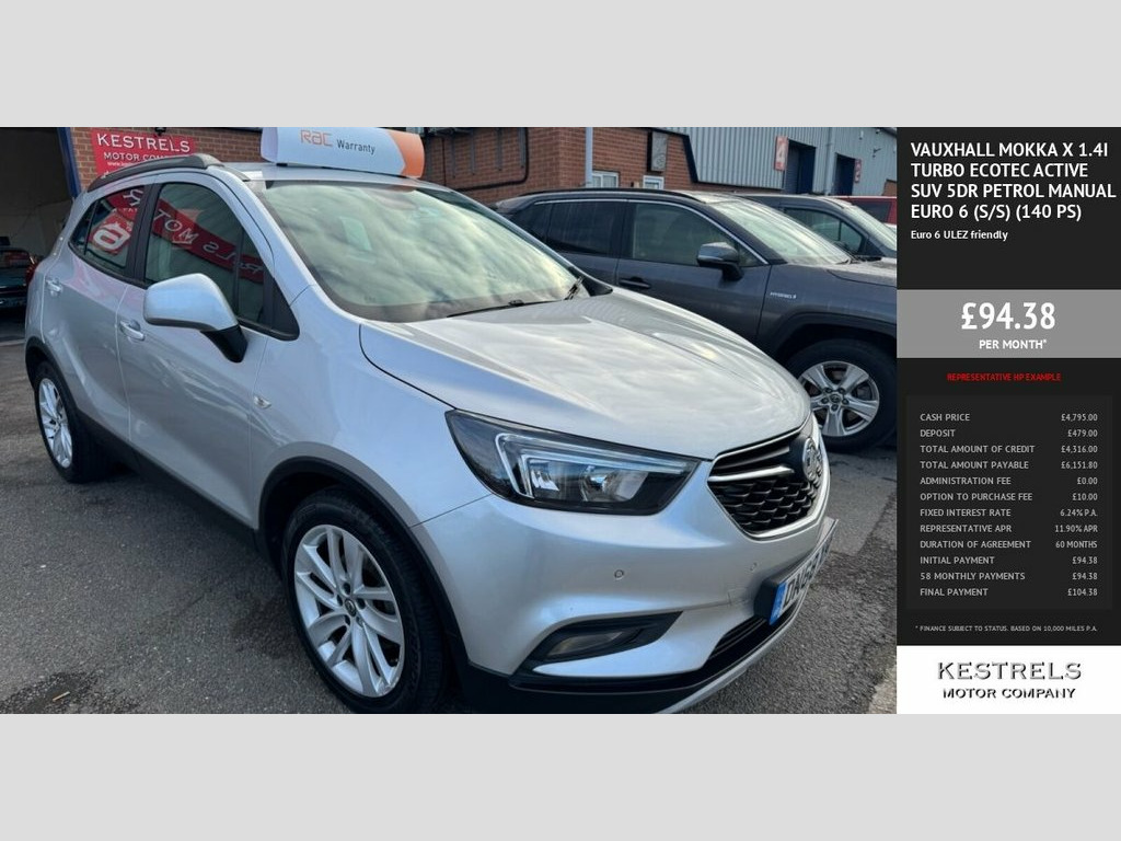 This 2018 Vauxhall Mokka X i Turbo Active boasts a full service history and a clear vehicle history check, offering you peace of mind. This Euro 6 compliant model features a 1.4 litre petrol engine with the Active trim level ensures a well equipped driving experience, making it a practical choice for everyday use. The Mokka X i Turbo Active is designed for efficiency and performance, with an impressive 0-60mph acceleration time of just 9.6 seconds. Its low insurance group rating further enhances its appeal, indicating that running costs are likely to be more affordable compared to similar vehicles. This combination of performance, economy, and favourable running costs makes this Vauxhall Mokka X a compelling option. Part exchange welcome, finance arranged 12-Volt Electrical Accessory Socket, 12-Volt Power Outlet Behind Front Seats, 18in Alloy Wheels - Silver Effect, 60-40 Split Flip and Fold Rear Seat, ABS - Anti-Lock Braking System, Adaptive Brake Lights, Airbag - Drivers, Airbags - Front Seat Side-Impact, Armrest - Drivers, Automatic Lighting Control, Automatically Dimming Anti-Dazzle Rear-V, Black B-Pillars, Black Door Panels with Black Atlantis Cl, Black Facia, Body Colour Door Mirrors, Body Side Protection Mouldings, Body-Colour Door Handles, Burst-Proof Door Locks and Anti-Jam Door, Central Facia Display, Child Proof Locks on Rear Doors, Chrome Effect Front Grille Bar, Chrome Effect Interior Door Handles, Collapsible Windscreen Wiper Sy