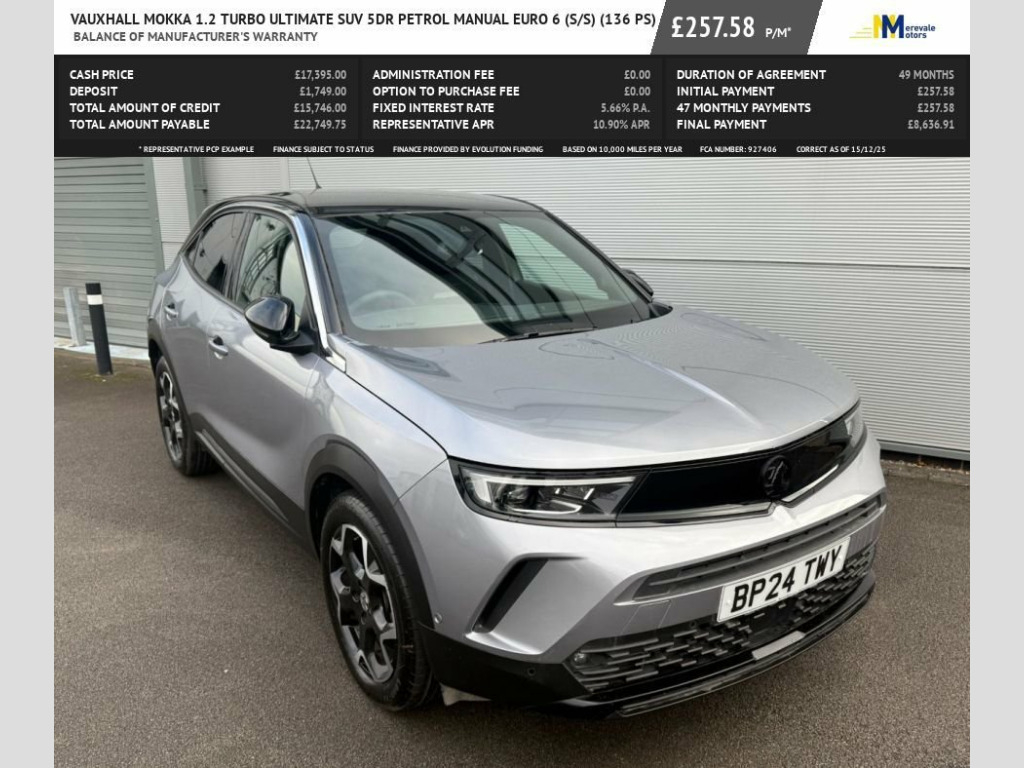 BOASTING EXCEPTIONALLY LOW MILEAGE FOR A 2024 MODEL, THIS VAUXHALL MOKKA TURBO ULTIMATE PRESENTS A SUPERB OPPORTUNITY. WITH ONLY ONE OWNER AND A CLEAR VEHICLE HISTORY CHECK, THIS EURO 6 COMPLIANT MOKKA IS IN EXCELLENT CONDITION. IT FEATURES A RESPONSIVE 1.2L PETROL ENGINE AND COMES EQUIPPED WITH DESIRABLE FEATURES SUCH AS A PANORAMIC REAR VIEW CAMERA WITH PARKING ASSISTANCE, HEATED FRONT SEATS, ELECTRONIC CLIMATE CONTROL, A HEATED STEERING WHEEL FOR THOSE COLDER MORNINGS, AND CONVENIENT KEYLESS ENTRY AND START. EXPERIENCE IMPRESSIVE PERFORMANCE WITH A 0-60MPH ACCELERATION TIME OF JUST 9.1 SECONDS, DEMONSTRATING ITS CAPABILITY. THIS MOKKA ALSO EXCELS IN EFFICIENCY, ACHIEVING A REMARKABLE 51 MILES PER GALLON, WHICH IS A SIGNIFICANT ADVANTAGE OVER MANY OTHER VEHICLES IN ITS CLASS. FURTHERMORE, ITS LOW CO2 EMISSIONS CONTRIBUTE TO A MORE ENVIRONMENTALLY CONSCIOUS DRIVE. FINANCE IS AVAILABLE AND WE CAN BUILD A PACKAGE TO SUIT YOUR INDIVIDUAL NEEDS, JUST VISIT OUR WEBSITE AND CLICK ON APPLY FOR FINANCE TO USE THE FREE ELIGIBILITY CHECKER AND THEN SIMPLY APPLY. ALL OUR VEHICLES ARE MECHANICALLY INSPECTED BY INDEPENDENT CONTRACTORS IN ADDITION TO EXTENSIVE BACKGROUND AND MILEAGE CHECKS PRIOR TO SALE .. HPI CLEAR AND SUPPLIED WITH ALL THE ORIGINAL HANDBOOKS AND TWO KEYS. PLEASE CALL 01455891117 TO ARRANGE A VIEWING AND A TEST DRIVE, YOUR PART EXCHANGE WILL BE MOST WELCOME. 18in Alloy Wheels - Bi Colour, Multimedia Pure Panel Navigation System, Panoramic Rear View Camera, Adaptive Cruise Control, Heated Front Seats, Sports Switch with Engine Sound Enhancem, Lane Keep Assist with Lane Departure War, Contrast Grey, 12in Digital Instrument Cluster, IntelliLux Matrix LED Headlights with Ad, 2 Rear USB Connections, ABS - Anti-Lock Braking System, Airbag - Driver, Airbags - Deactivation Switch For Front , Airbags - Front Passenger, Airbags - Front Seat Side-Impact, Airbags - Full Size Curtain, Armrest - Front Centre with Storage, Automatic Headlight Levelling System, Automatic Lighting Control with Tunnel D, Automatically Dimming Anti-Dazzle Rear-V, Black Door Mirror
