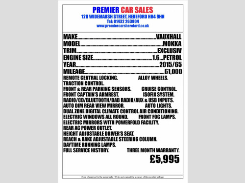 This 2015 Vauxhall Mokka 1.6 i Exclusiv SUV is currently available for £5,995 in Hereford Herefordshire with Petrol engine and Manual gearbox. For more information or to arrange a viewing, click here to send us an email using form below.