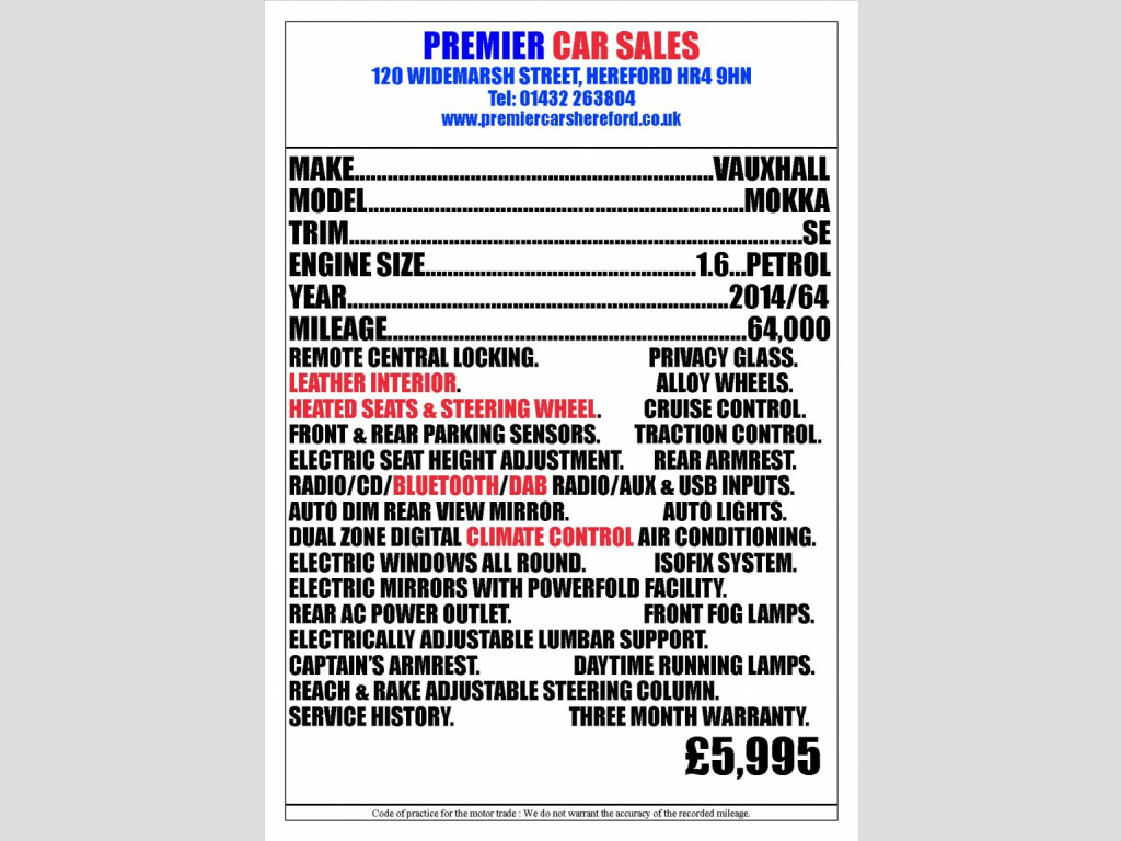This 2015 Vauxhall Mokka 1.6 SE SUV is currently available for £5,995 in Hereford Herefordshire with Petrol engine and Manual gearbox. For more information or to arrange a viewing, click here to send us an email using form below.