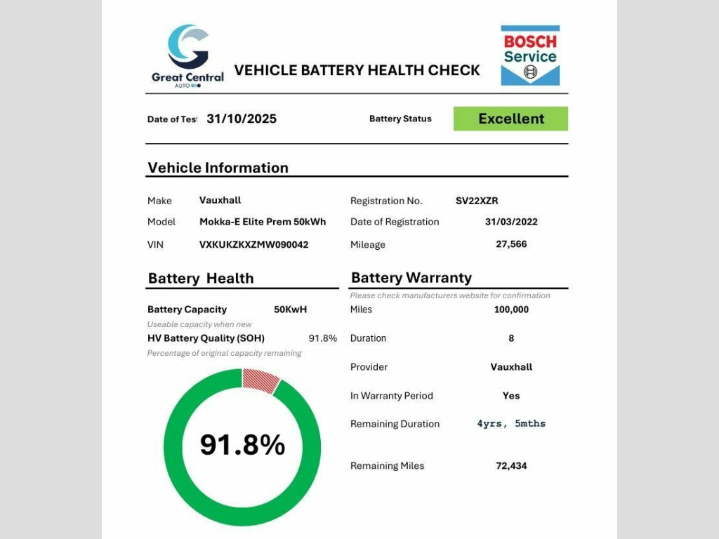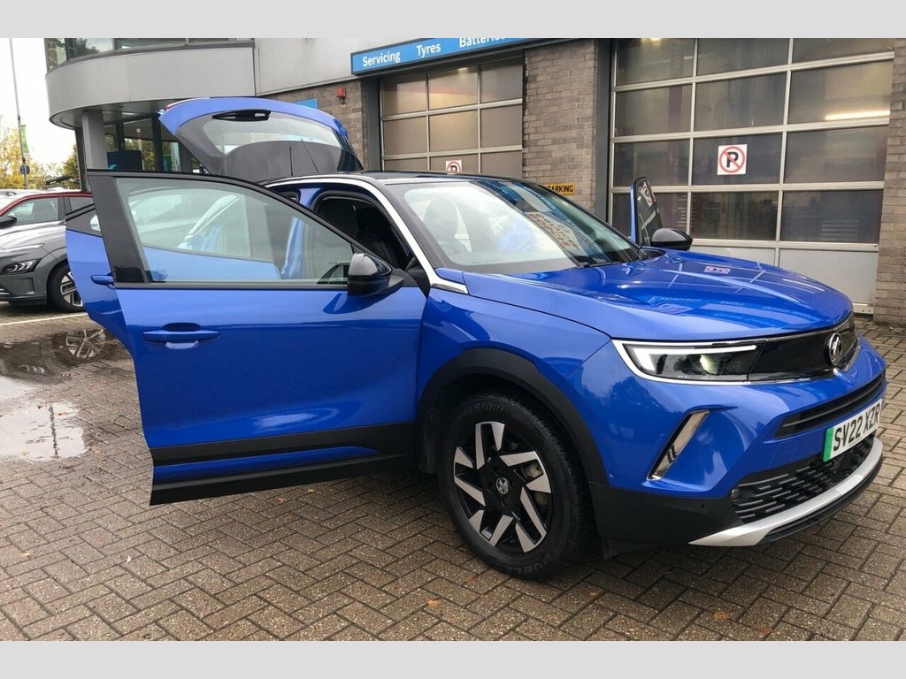 ##BATTERY HEALTH REPORT 91.8%## This 2022 Vauxhall Mokka Electric Elite Premium is a Vauxhall manufacturer approved vehicle with a clear vehicle history check and only one owner.  It boasts a 50 kWh battery offering a maximum range of 209 miles when new, and benefits from an MOT valid until April 2026.  Key features include LED headlights, Side Blind Spot Alert with Flank Guard, and a Front Camera System for enhanced parking assistance.  Inside, you'll find Electronic Climate Control and Automatic Lighting Control with Tunnel Detection, ensuring a comfortable and convenient driving experience.  The Mokka Electric Elite Premium provides a smooth and efficient electric driving experience. Charging is convenient, with a full charge at home taking approximately 7 hours and 35 minutes using a 7kW charger, while rapid public charging can achieve 80% capacity in just 36 minutes from empty. These capabilities, combined with its comprehensive safety and comfort features, position this Mokka Electric as a superior choice for those seeking a modern and well maintained electric vehicle. Voltaic Blue, Fabric-Leather Effect - Jet Black, 10in Multimedia Navi Pro with Live Navig, 11kW Three-Phase On-Board Charger, 12V Electrical Accessory Socket - Front, 12in Digital Instrument Cluster, 17in Alloy Wheels - Bi-Colour, 2 Rear USB Connections, ABS - Anti-Lock Braking System, Active Drive Assist Plus, Adaptive Brake Lights, Adaptive Cruise Control, Air Recirculation System, Airbag - Driver, Airbags - Deactivation Switch For Front , Airbags - Front Passenger, Airbags - Front Seat Side-Impact, Airbags - Full Size Curtain, Alloy Sport Pedals, Armrest - Front Centre with Storage, Atlantis Black Trim Inserts on Front Doo, Automatic Lighting Control with Tunnel D, Automatically Dimming A