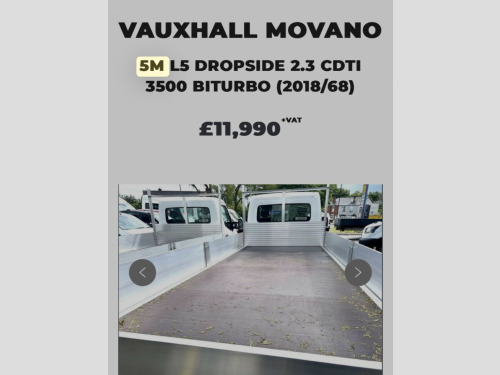 This 2018 Vauxhall Movano 5M DROPSIDE 2.3 CDTi 3500 BiTurbo Dropside Truck is currently available for £11,990 in Birmingham West Midlands with Diesel engine and Manual gearbox. For more information or to arrange a viewing, click here to send us an email using form below.