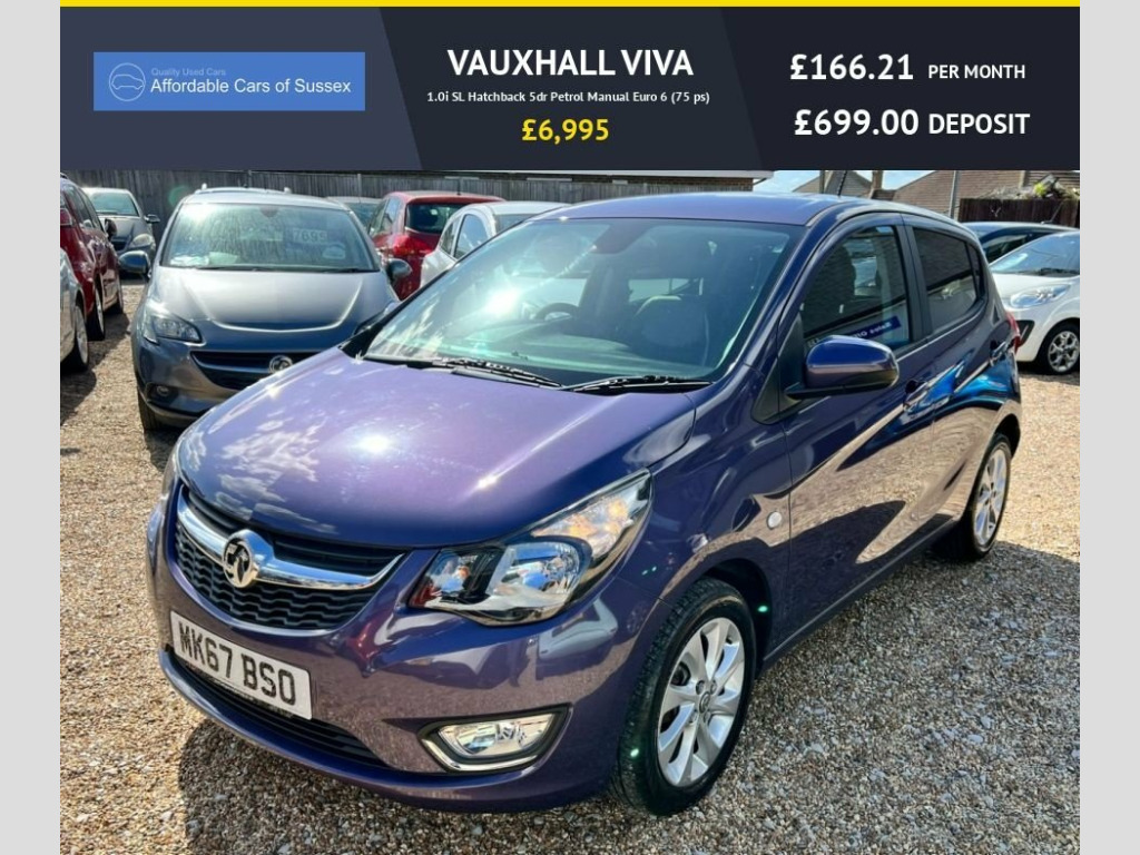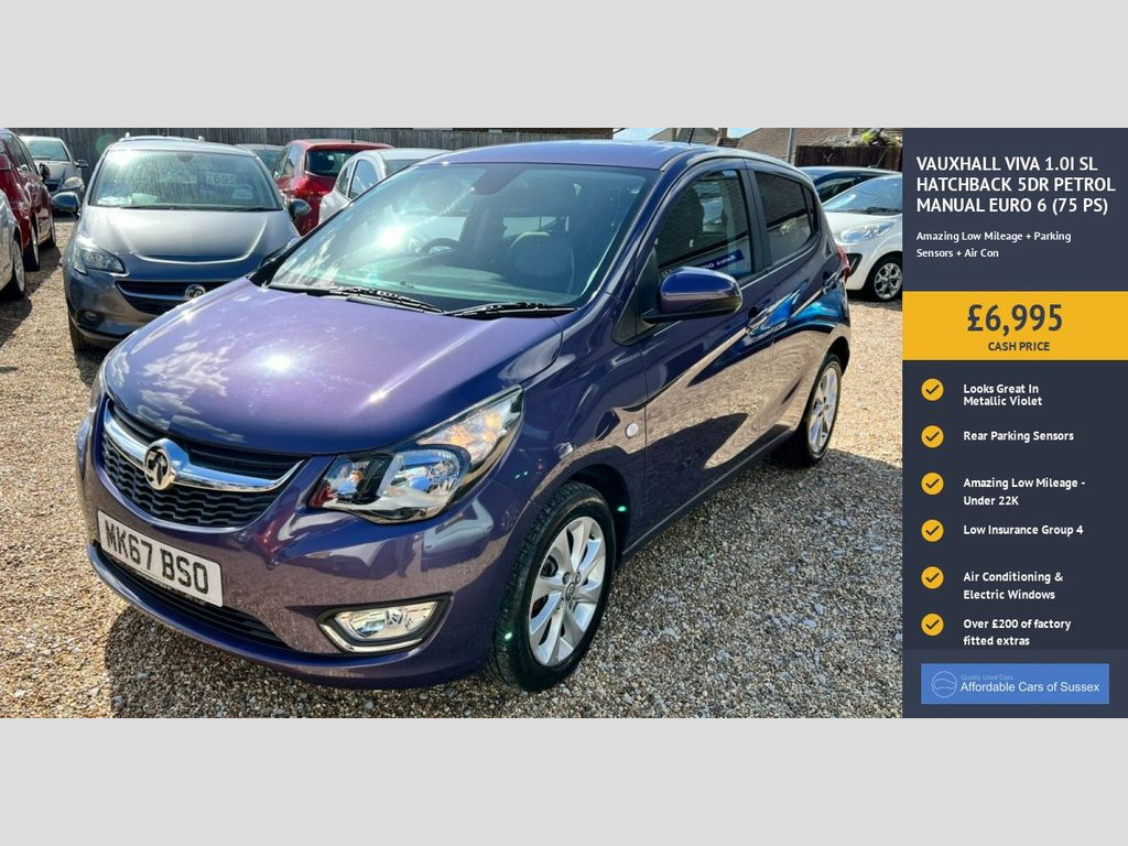 A lovely Vauxhall Viva SL finished in metallic Violet. This very low mileage car has less than 22,000 miles from new and comes with two keys. Well equipped it features rear parking sensors, electric windows, air conditioning, remote central locking and more.  Top 5 Reasons to buy this car; 1; Stunning Metallic Violet Paintwork 2; Super Low Mileage Example 3; Air Conditioning & Electric Windows 4; Free Warranty included with no admin or hidden fee's - Fully transparent sales process 5; Bought from a local trusted family Dealer with over 60+ years experience Rear Parking Distance Sensors, 12V Electrical Accessory Socket, 15in Alloy Wheels, 60-40 Split-folding Rear Seat Back and S, ABS - Anti-Lock Braking System, Adaptive Brake Lights, Airbag - Drivers, Anti-Submarining Ramps in All Seats, Black Gloss Radio Surround, Black Gloss Surround to Outer Facia Air , Body-Colour Door Handles Lack Foil on B-, Child Proof Locks on Rear Doors, Chrome Effect Front Grille Bar, Chrome Effect Interior Door Handles, Chrome-Effect Inserts to Outer Facia Ven, Climate Control - ECC - Electronic, Cruise Control with Speed Limiter, Dark Tinted Rear Windows, Daytime Running Lights, Deactivation Switch for Front Passengers, Digital Fuel Gauge with Low Fuel Level W, Digi