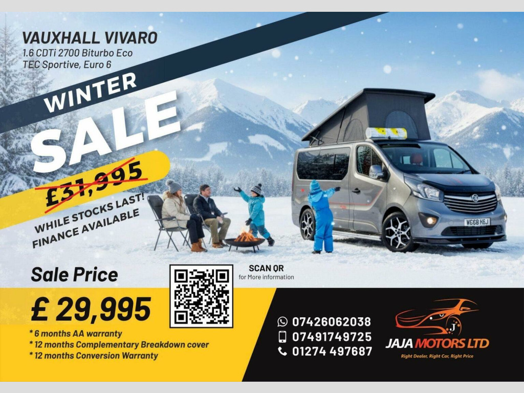 KINDLY WATCH FULL VIDEO, WHEN ITS GONE ITS GONE HERE WE HAVE AN OTHER BRAND NEW CONVERSION & VERY STYLISH CAMPER VAN, PART EXCHANGE WELCOME, FINANCE AVAILABLE, NO VAT, VAUXHALL VIVARO 1.6 CDTi 2700 BiTurbo eco TEC SPORTIVE PANEL VAN, 5dr DIESEL, MANUAL, L1 H1, EURO 6 (125 ps), ULEZ COMPLIANT, SWB, CONVERTED TO A VERY HIGH STANDARD, POP TO ROOF WITH BED, 4 BIRTH, 5 SEATS, M1 CRASH TESTED ROCK AND ROLL BED WITH RECLINER, PLENTY OF STORAGE, FRIDGE/FREEZER, TWIN BURNER & SINK, GAS OVEN & GRILL, TV & LED LIGHTS, 240v SOCKETS, USB POINTS, LEISURE BATTERY, 240v HOOK UP, GAS BOTTLE WITH LOCKER & COMES WITH GAS SAFETY CERTIFICATE, WATER BOTTLE, BONNET DEFLECTOR, SIDE BARS, LOWER SPLITTER, REMOVABLE DINING TABLE, PRIVACY GLASS ALL AROUND & CURTAINS TO FRONT SIDE WINDOWS AND REAR, FULLY INSULATED, SOUND DEADENED, INVERTER, SPLIT CHARGER, 200w SOLAR PANEL, NIGHT DIESEL HEATER, THE REAR SEATS CONVERT INTO A ROCK AND ROLL BED (WITH UNDER-STORAGE) AND THE FRONT PASSENGER SEATS SWIVEL TO FACE INWARDS PROVIDING A COSY SOCIABLE SPACE, FULL SERVICE HISTORY, MAINTAINED VERY WELL, 6 MONTHS NATIONWIDE WARRANTY WITH AA, 12 MONTHS FREE BREAK DOWN COVER WITH AA, 12 MONTHS WARRANTY OF ALL APPLIANCES, COMES WITH FRESH MOT, JUST COVERED 35929 WARRANTED MILEAGE (MOSTLY DONE ON MOTORWAY), ALLOY WHEELS & TYRES, PARKING SENSORS, CRUISE CONTROL, AIR CONDITIONING, SAT NAV, FRONT DASH CAM, PORTA POTTI, POP TOP MATTRESS, HOOK UP CABLE, JUST DONE FULL SERVICE, TEST DRIVE HIGHLY RECOMMENDED, RESERVE NOW WITH A FULLY REFUNDABLE DEPOSIT, WE ARE AN FCA REGISTERED DEALER, APPROVED DEALER FOR CAR FINANCE 247 & PEGASUS FINANCE, LOW RATE 0% DEPOSIT FINANCE AVAILABLE, MORE TECHNICAL DETAILS, FEATURES & FINANCE CALCULATION OF THIS CAMPER-VAN KINDLY VISIT OUR WEBSITE, www.jajamotors.co.uk, VIEWINGS BY APPOINTMENT ONLY, BUY WITH CONFIDENCE SEE OUR CUSTOMER REVIEWS, LIVE VIDEO AVAILABLE, NATIONWIDE HOME DELIVERY AVAILABLE, WE ARE OPEN 7 DAYS A WEEK CALL OR TEXT *** 01274497687 *** *** 07426062038 *** ANY TIME***THIS CAMPER-VAN IS HPI ALL CLEAR