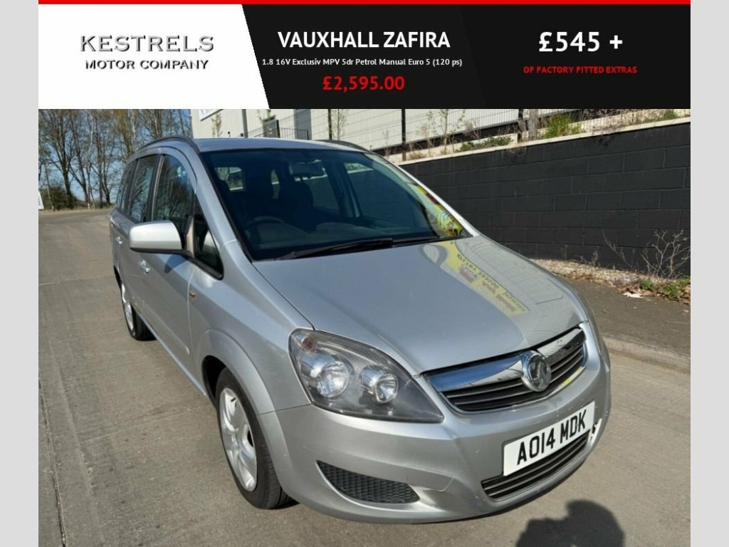 Very popular Vauxhall Zafira 1.8 16v Exclusive 7 seater, manual, only 87,968 miles, nice condition throughout. Service history, recent service and MOT. Comes with metallic paint, 2 keys, electric mirrors, multi function steering wheel, phone connectivity, CD/MP3/Radio, AC etc Part exchange welcome, finance arranged, 3 months Autoguard premium assist warranty with roadside assistance included. 12V Power Socket - Front, 12V Power Socket - Luggage Compartment, 16in Structure Wheels, 20 Watts Per Channel Output, ABS - Anti Lock Brakes, Air Conditioning, Air Recirculation System, Airbags - Curtain, Airbags - Front Side, Airbags - Passenger, Airbags - Passenger Deactivation, AUX Connection, Black Foil on B-Pillar, Body Colour Side Protection Mouldings, Body Colour Tailgate Handle, Body-Colour Door Handles, Bumpers - Body Coloured, CBC - Cornering Brake Control, Centre Storage with Two Cup Holders, Dark Style Headlights, Digital Clock with Automatic RDS Time Ad, Door Mirrors - Body Coloured, Door Mirrors - Electric - Heated, Drinks Holder - Second Row Door Pockets , Drivers Airbag, EBA