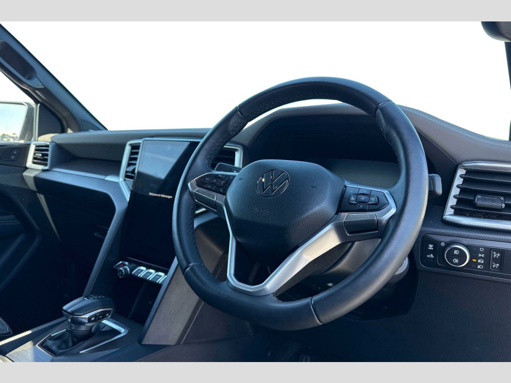 The exterior features striking 20-inch Bendigo alloy wheels, robust side steps with chrome inserts, and a chrome styling bar for added visual appeal. For visibility and safety in all conditions, the Amarok comes equipped with IQ.Light LED Matrix headlamps with Dynamic Light Assist, rain-sensing wipers, a heated windscreen, and power-adjustable, heated, and folding exterior mirrors. Manoeuvring is made easy thanks to Park Assist Plus, front and rear parking sensors, and an advanced 360° Area View camera system. At the rear, the cargo bed is designed with everyday practicality in mind, featuring integrated ruler markings on the tailgate and tie-downs to keep loads secure.