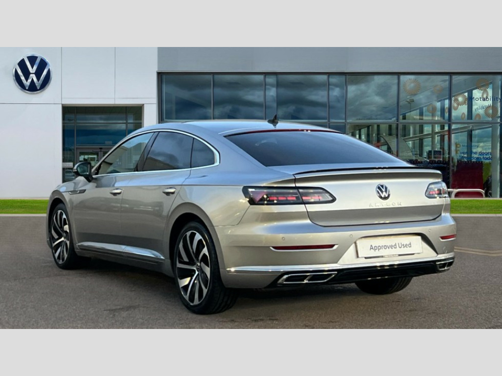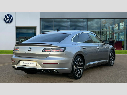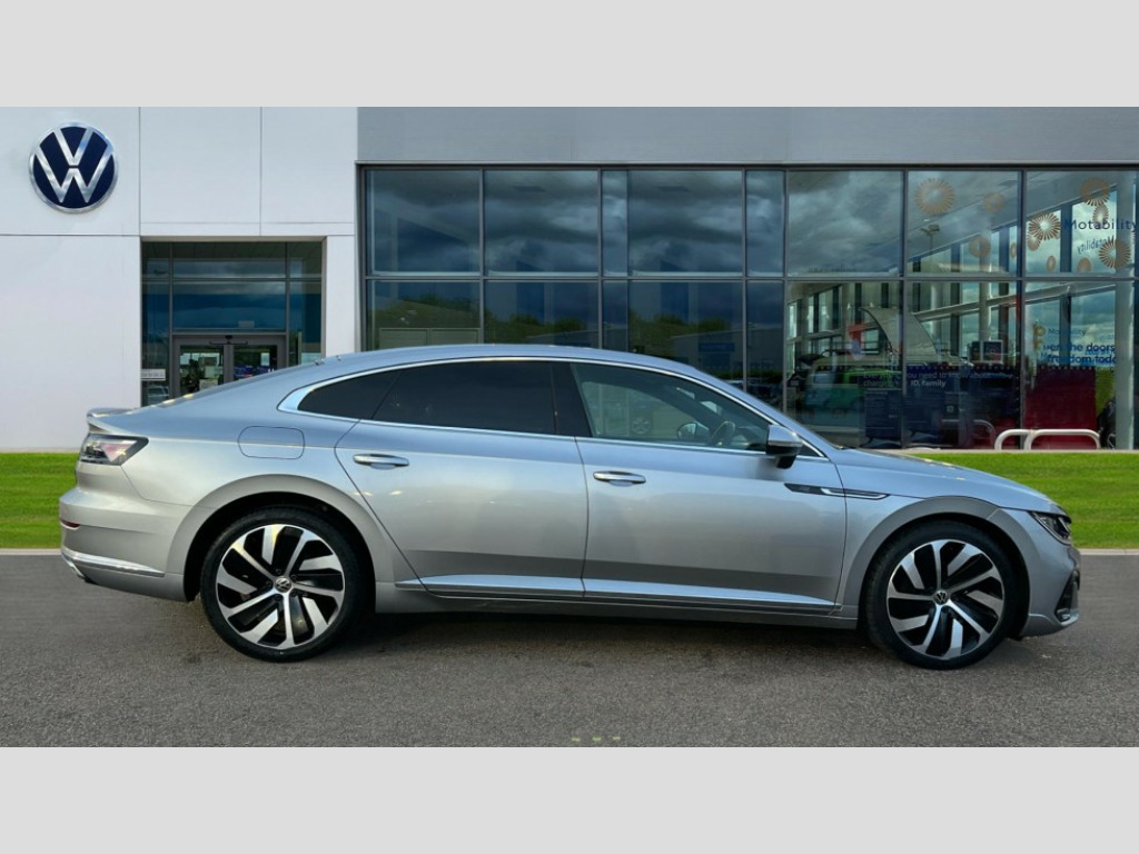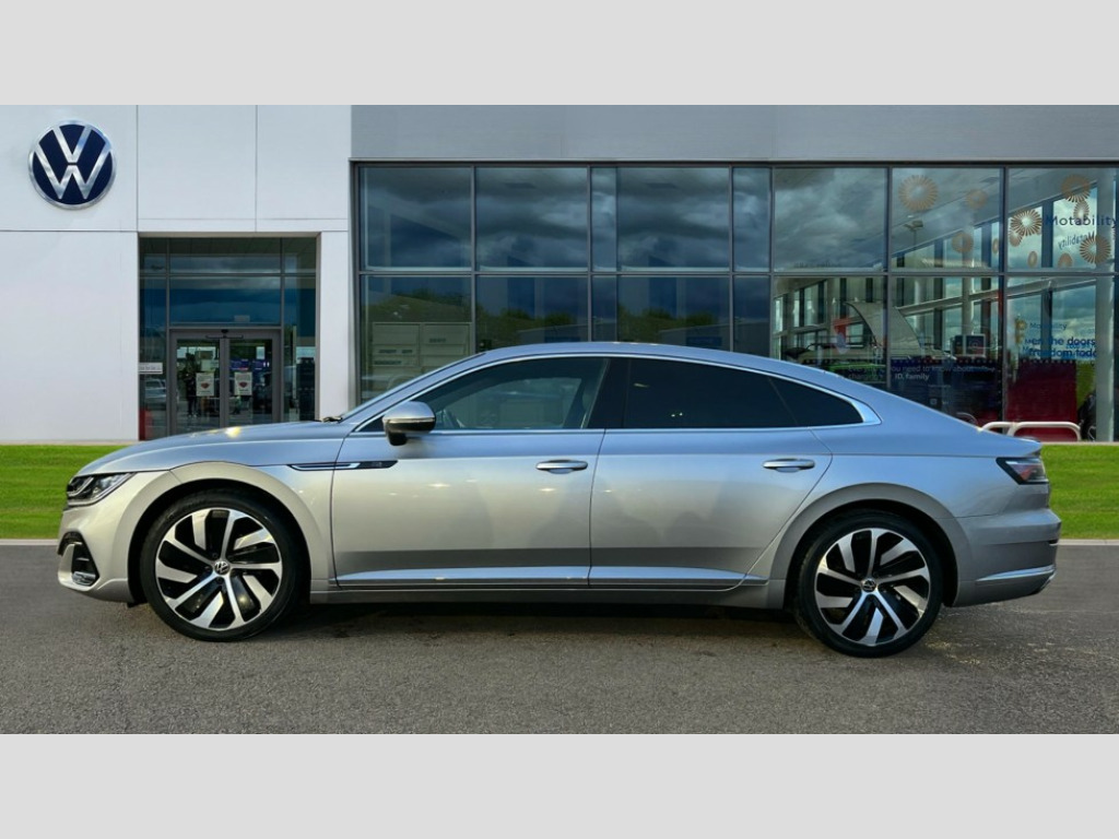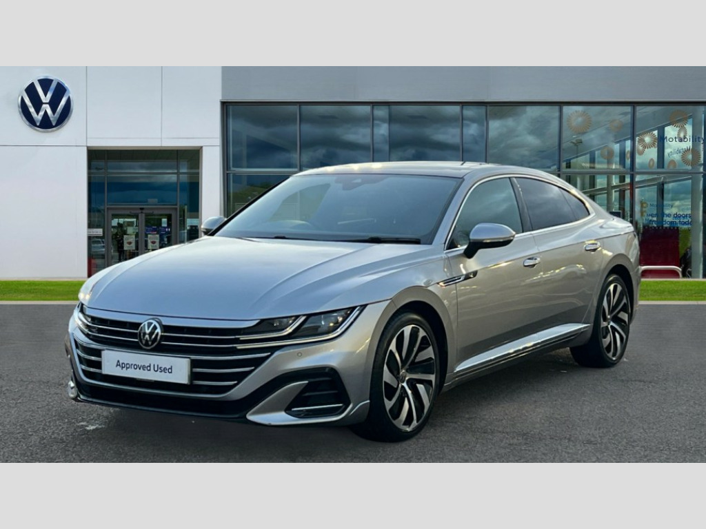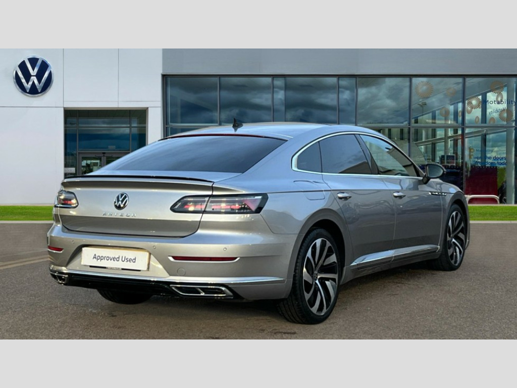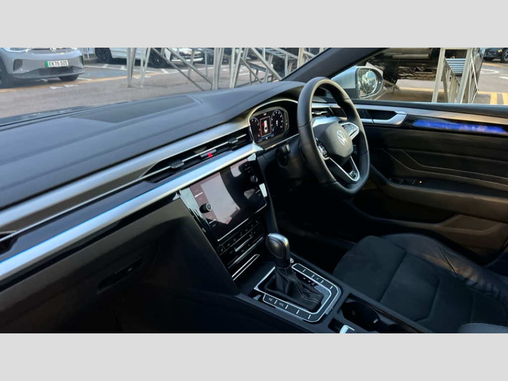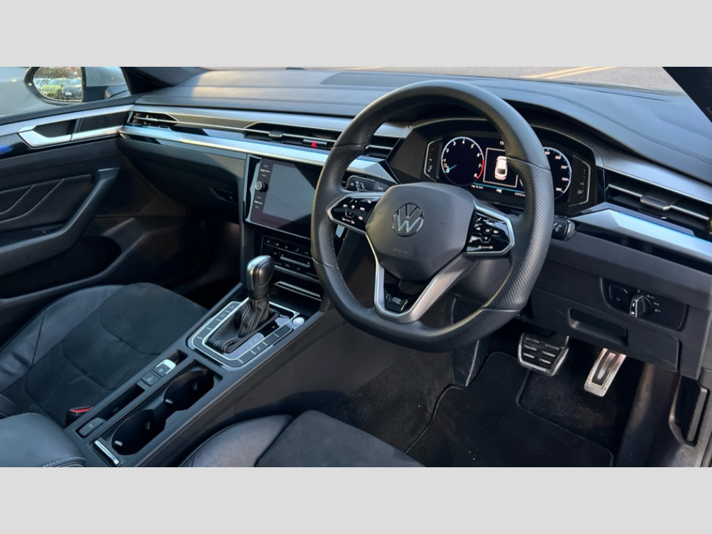 Volkswagen Arteon 2.0 TSI R-Line 5dr DSG Adaptive cruise control (ACC) with speed limiter, front assist (reacting vehicles pedestrian and cyclists) and follow to stop, App connect including wireless Apple CarPlay, Camera for warning system, Digital cockpit with 10.25" high resolution TFT display screen with customisable menus and information, Driver alert system with fatigue detection, Driver profile selection including ECO function, Dynamic road sign display, eCall - Emergency call service for SOS calls to emergency response, Emergency assist, Hands free boot opening, Press and drive key, Progressive steering, Speedo and rev counter, electronic odometer, trip, service interval display and exterior temperature gauge, Travel assist - Lane keeping assist and traffic jam assist, Voice activation for telephone and navigation, Start/stop function with battery regeneration, Premium USB cable in choice of either Apple or Android smartphone compatibility, Auto dimming interior rear view mirror, Body colour door handles, Body colour side skirt, Body coloured top and matt black lower door mirrors with integrated indicators, Chrome plated radiator grille inserts and light switch surrounds, Chrome side window surrounds, Dynamic headlight range control, Electric folding door mirror, adjustable, heated with front passenger exterior mirror lowering function, Front and rear electric windows, Front and rear stainless steel door sill protection, Front windscreen washers and wipers with 4x interval delay, Heat insulating side and rear windows, Heated rear windscreen, Heated windscreen washer jets, High level 3rd brake light, LED rear combination lamp with dynamic indicators, LED rear number plate lights, Panoramic sunroof with tilting and sliding including integrated roller blind, R Line design body coloured bumpers, Rain sensor, Rear fog lamp on one side and reversing lamp on both sides, Rear tinted glass from B pillar backwards, approx 65% tinted, Tailpipes behind rear bumper, 12V socket in front centre console, 12V socket on rear of front centre armrest, 3 rear head restraints, 30 colours options interior ambient lighting, 60:40 split folding rear seat backrests with centre armrest, Air care climatronic 3 Zone electronic air conditioning with automatic air recirculation, Black roof lining, Chrome trim on upper and lower air vents extending across cockpit, Driver and front passenger sunvisor with vanity mirror, Front + rear carpet mats, Front cupholders x 2, Front footwell illumination, Front sports comfort seats, Glovebox, Heated front seats, Height/reach adjust steering wheel, Isofix child seat preparation easy fit for two outer rear seats, Luggage compartment lighting, Removable luggage compartment cover, Split folding front seat backrest with front centre armrest, Stainless steel pedals, Two LED front reading light, 3 rear three point seatbelts, ABS+EBD+Brake assist, Driver airbag and front passenger airbags with deactivation switch including driver knee airbags, Electronic parking brake, Electronic stability control (ESC) and Electromechanical brake booster, Front disc brakes, Front side airbags with curtain airbags, Hill start assist, Pro active occupant protection to detect critical situations with elevated accident potential from the front, Rear disc brakes, Three point height adjust front seatbelts + pretensioners, Two tone horn, Tyre pressure loss indicator, Warning buzzer for seatbelts if unfastened, Warning triangle, Alarm with interior protection with deactivation via infotainment system, Electronic engine immobiliser, Keyless entry system including start/stop button on centre console, Aluminium decorative inserts, Chrome trim on lower doors in front and rear, Leatherette insert on door and side trim panel in foam film, Piano black decorative inserts in centre console
