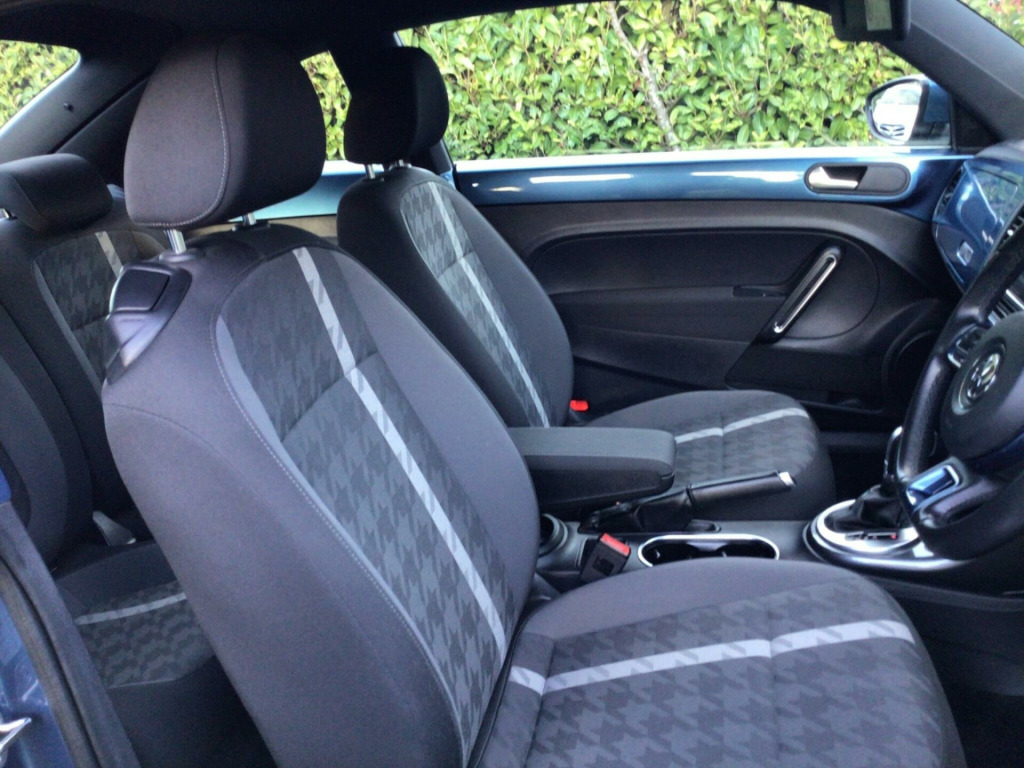 Unique Opportunity To Purchase This Volkswagen Beetle 1.2 Design Automatic, Silk Metallic Blue With Dark Grey Cloth Upholstery, 2 Lady Owners With A Incredible 20000 Miles From New , Super Condition Throughout, Must Be Seen To Be Appreciated . v socket - centre console x2, 17in alloy wheels - orbit, abs - anti-lock braking system with hba - hydraulic brake assist, air conditioning - climatic semi-automatic control, alarm with interior protection, armrest - front centre with storage compartment, automatic post-collision braking system, black grained door sill protection, body coloured dash and door panels, body-coloured door handles, body-coloured door mirrors with integrated indicators, body-coloured bumpers in more aggressive design, brake pad wear indicator, carpet mats - front and rear, chrome strip on side window base, chrome trimmed air vent surrounds - decor rings - instrument cluster and radio surround, composition media system, cup holders - front x2 rear x1, dab+ - digital radio reception, dark tinted tail lights, door mirrors - electrically adjustable and heated, door protectors - body colour with chrome insert, driver and front passenger seat height adjustment, drivers and front passengers airbags with front passenger airbag deactivation switch, drivers and front passengers combined head and side airbag system, esc - electronic stability control including edl - electronic differential lock and asr - traction control, electric windows - front, electronic engine immobiliser, external temperature gauge, frameless rear view mirror, front air intake with chrome trimmed louvre, front fog lights with static cornering function, front seat back storage pockets, front three-point seat belts, glovebox, grab handles - front x2 rear x2, head restraints - front whiplash optimised, headlights - halogen clear - range adjustable, heated rear windscreen, height and reach adjustable steering wheel, hill hold function, isofix child seat preparation for 2 rear seats, instrument lighting - white adjustable panel illumination, intermittent windscreen wiper control, leather trimmed gear knob and handbrake grip, luggage compartment cover and hook - removable, luggage compartment light, multifunction computer, power assisted steering - speed sensitive, reading lights - front x2, rear head restraints x 2 - height-adjustable, rear tailgate spoiler, reflectors in doors, remote central locking with 2 remote folding keys, seats - easy entry sliding front, seats - split folding rear backrests 50-50, spare wheel - space saver steel, speedo and rev counter - electronic odometer - trip - service interval display and fuel gauge, steering wheel - multifunction - leather trimmed, two rear three-point seatbelts, two-tone horn, tyre pressure loss indicator, usb interface for ipod - iphone and aux-in jack, unique beetle storage compartment in dashboard, vanity mirrors, warning buzzer and light for front seat belts if unfastened