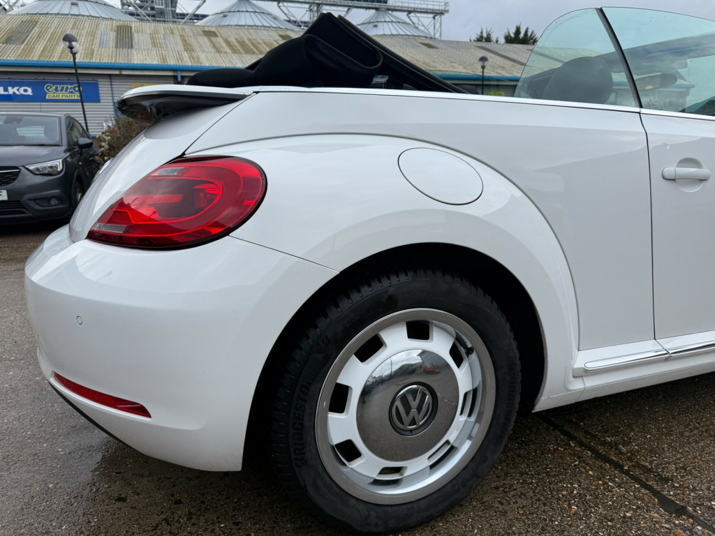 We are please to offer another superb example Beetle Convertible. This car has clearly been cherished by its previous lady owner who was a member of the VW Beetle Owners Club. The car has been garaged whilst not in use hence the immaculate condition both inside and out. We have a full service history plus replacement timing belt with the car and 2 x keys along with the roof cover and accessories. The value of well maintained cars like these cars are climbing gradually. Black fabric electric roof.Front and rear parking sensors.Grey cloth seats.Radio stereo .Tonneau roof cover.Same lady owner since 2017.Viewing by appointment please.6 months extendable warranty included.Part exchange welcome.Competitive finance available.HPI clear. v socket - centre console x2, 6cd autochanger - dash mounted, aux-in socket, bluetooth telephone preparation for hands free profile enabled telephones, dab+ - digital radio reception, mdi - multi device interface with usb - ipod connection cables, rcd 510 touch screen radio system, sd card reader, speakers x8, 17in alloy wheels - orbit, anti-theft wheel bolts, body coloured bumpers, body coloured door handles, body coloured rear spoiler, body-coloured door mirrors with integrated indicators, door mirrors - electrically adjustable and heated, electric windows - front, spare wheel - space saver steel, abs - anti-lock braking system, asr - anti slip regulation, active rollover protection system, airbags - curtain head, airbags - driver, airbags - front passenger with deactivation switch, airbags - front side, alarm with interior protection, central locking - remote with 2 remote keys, differential lock - electronic, esp - electronic stability programme, electronic engine immobiliser, hba - hydraulic brake assist, hill hold assist, isofix child seat preparation for 2 rear seats, rigid safety cell with front and rear crumple zones, seatbelt reminder, air conditioning - manual, armrest - front centre with storage compartment, body coloured door sill protection, carpet mats - front and rear, cup holders - front x2 rear x1, dashboard - body coloured, drivers seat height adjustment, electric folding roof, front passengers seat height adjustment, front seat back storage pockets, fully automatic electric power hood, glovebox - illuminated - lockable, grab handles - front x2 rear x2, head restraints - front whiplash optimised, head restraints - rear x2, height and reach adjustable steering column, leather trimmed gear knob, leather trimmed handbrake grip, luggage compartment - hook - removable, particle filter, reading lights - front x2, seats - easy entry sliding front, seats - split folding rear backrests 50-50, steering wheel - 3-spoke - leather trimmed - multifunction, steering wheel - multifunction, sun visors with vanity mirrors, tonneau cover, unique beetle storage compartment in dashboard, warning lights for open tailgate and doors, brake pad wear indicator, exterior temperature gauge, multifunction computer - highline - includes visual gear change recommendation, power assisted steering - speed sensitive, suspension - four link rear, tyre pressure indicator, warning light for low washer fluid, front fog lights with cornering lights, headlights - halogen clear - range adjustable, high level 3rd brake light