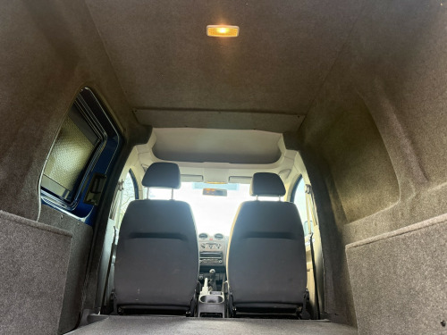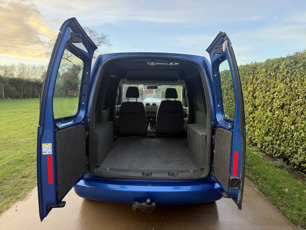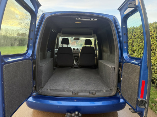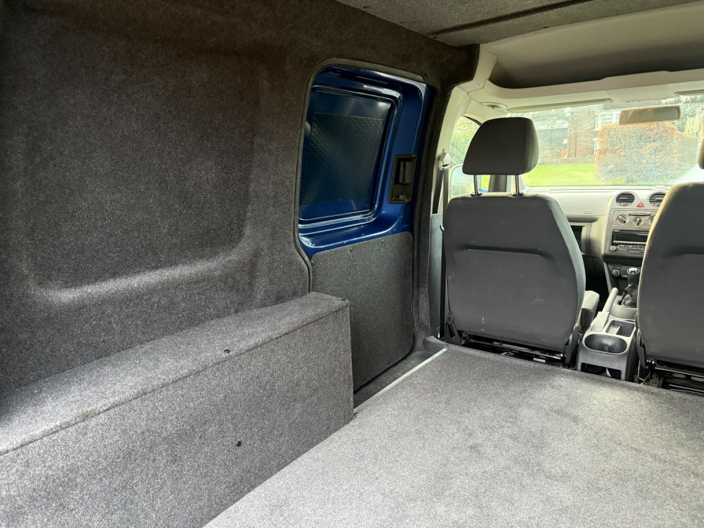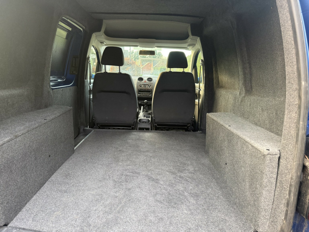 VW custom caddy! Finished in metallic blue, alloy wheels, rear parking sensors and a fully custom interior! Fully insulated, ply line panels, and soundproofed throughout. Fully carpeted in graphite 4mm premium stretch including roof lining. This is a brand new rear conversion so is unmarked! , Very rare metallic, alloy wheels, reversing aid, tow bar, cruise control, 2 keys etc. a great looking business van or an ideal camper base!, Just 1 former keeper from new! 79300 miles.