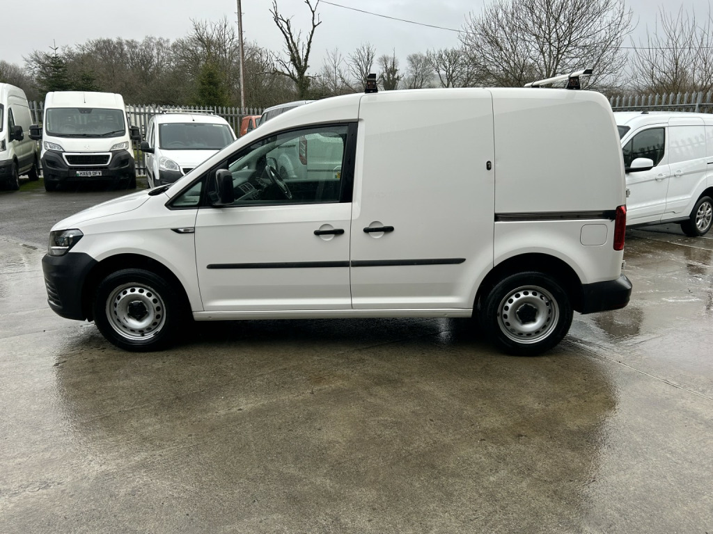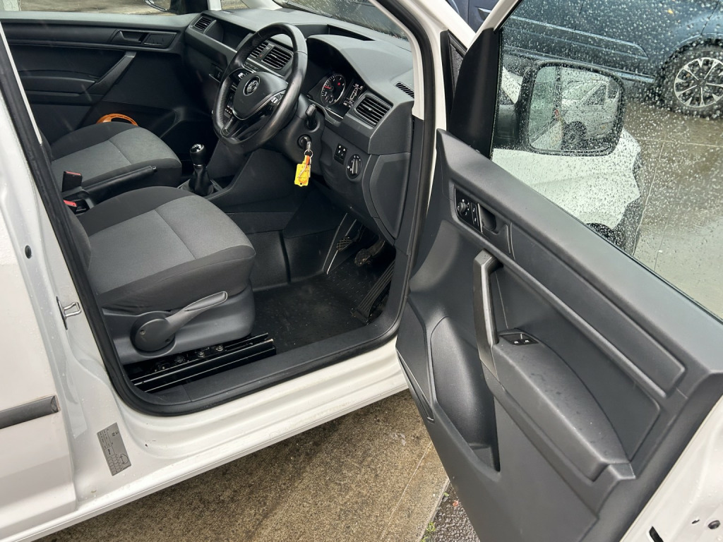 Volkswagen Caddy 2.0 TDI C20 Startline finished in White (Manual), 44650 miles, 1 Lease Company Owner, 2.0 Tdi 102ps, Euro 6, Air Conditioning, Side loading, Bluetooth connection, PAS, Service indicator, Trip computer, Radio/CD, Electric door mirrors, Heated door mirrors, Front electric windows, Solid Paint, ABS, Drivers airbag, ESP, Remote central locking, Cloth seat trim, Ply Lined, Bulkhead, Racking, Roof Rack, Rear Parking Sensors