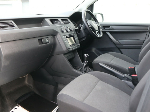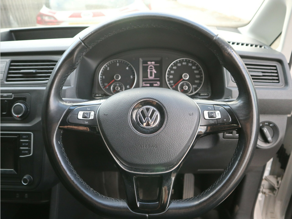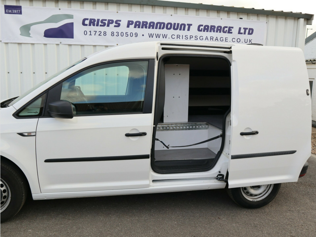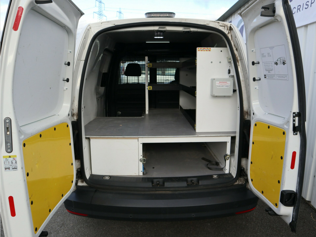 2020 Volkswagen Caddy 2.0 TDI C20 Startline ULEZ compliant Panel Van, with just 25000 miles on the clock. Fitted with rear windows (with security grills) and a security bulkhead. Other specifications include rear parking sensors, electrically adjustable & heated door mirrors, DAB Plus Radio and security locks to rear and side loading door.The rear load space is currently fitted with storage solutions, but they can easily be removed if required. v socket, composition colour dab plus radio, black door mirrors and door handles, black wheel centre caps, door mirrors - electrically adjustable and heated, electric windows - front, full size steel spare wheel, heat insulating windscreen, roof rail preparation, tyres - low rolling resistance, 2 led spot lights in load compartment, dashboard - dimmable illumination, four drinks holders and storage compartment in centre console, full height bulkhead - solid lower and plastic mesh upper, glovebox - illuminated - lockable, head restraints - height adjustable, led interior light in headliner, load area lining - hardboard roof trim and painted half-height side panels, load lashing rings x6, manually controlled heating system with dust and pollen filter and air recirculation, rear wing doors with window apertures asymmetrically split, rubber floor covering in cab, seats - drivers height - reach and rake adjustment, single near-side sliding door, steering column - reach and rake adjustable, steering wheel - multifunction leather trimmed, tool kit and jack, windscreen wiper with variable intermittent delay and wash-wipe system, abs - anti-lock braking system, automatic hazard lights activation under emergency braking, automatic post-collision braking system, bas - brake assist system, differential lock - electronic, drivers and passenger front and curtain airbags, ebd - electronic brakeforce distribution, esp - electronic stability programme, electric seatbelt tensioners, front assist with city emergency braking system, hill hold assist, remote central locking with deadlocks-interior locking - two remote keys, seatbelt warning when not engaged, tcs - traction control system, thatcham category 2 immobiliser, digital clock, driver alert system, msr - engine drag torque control, multi-function display plus, rear parking sensors, electric door mirrors