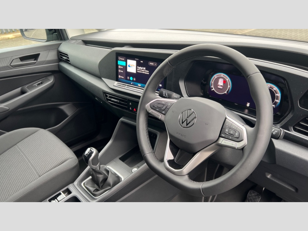 Volkswagen Caddy 2.0 TDI 102PS Commerce Pro Van [Tech Pack] Bluetooth - Mobile phone interface, Car2X technology, Driver alert system, eCall emergency system, Intelligent Speed Assist, Lane assist, Seatbelt warning indicator, Service indicator, Start-stop system with regenerative braking, 2 USB interfaces type C in dashboard, App-Connect - Wireless for Apple CarPlay, DAB Radio, Navigation system "Discover Media" with 25.4-cm (10-inch) colour touch screen incl. Streaming & Internet, 4 speakers, We Connect Plus Preparation, Automatic hazard light activation under emergency braking, Black painted exterior mirror housings, body-colored door handles and Silver sliding door rail, Body coloured bumpers, Electric front windows, LED rear combination lights, LED rear tail lights, Roof rail preparation, Windscreen wiper with variable intermittent delay and wash-wipe system, Dimming breakaway interior rear view mirror, Electronically controlled heating system, ergoComfort seats for driver, Interior light in headliner incorporting LED technology, Lockable glove compartment door with light, Manual heating and ventilation system, Manual height adjustment for front seats and seat cushion inclination and depth adjustment on drivers seat, Multi function leather steering wheel, Power-adjustable lumbar support for drivers seat, Reach and rake adjustable steering column, Six lashing points for securing loads, Storage compartments under driver and front passenger seats, Sun visors with mirror, airbag label on front passenger sun visor, Winter pack plus - Caddy, 3-point seat belts in front, with pretensioner and height adjustment, Driver and front passenger airbag with front passenger airbag deactivation, Tyre pressure monitoring system, Anti-theft alarm system, interior monitoring, backup horn, and towing protection, Electronic engine immobiliser, Remote central locking with deadlocks, interior locking, Anti locking braking system (ABS), Automatic post collision braking system, Autonomous Emergency Braking Front Assist with Pedestrian Monitoring, Brake assist, Diesel particulate filter, Electric parking brake with auto hold function, Electronic brake force distribution (EBD), Electronic differential lock (EDL), Electronic stabilisation programme (ESP), Engine drag torque control (MSR), Hill hold assist, Traction control system (TCS), Decorative beige birch vein inserts, Wheel bolts with anti-theft protection (unlockable)