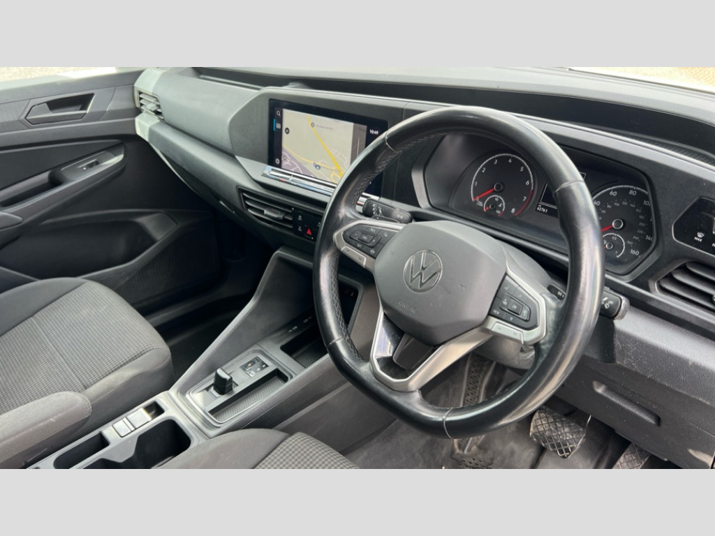 Volkswagen Caddy 1.5 TSI 114PS Commerce Pro Van DSG Driver alert system includes drowsiness detection, Emergency call control unit with eCall, Multi-function Display, Seatbelt warning indicator, Service indicator, Start-stop system with regenerative braking, We Connect Plus Preparation, Automatic hazard light activation under emergency braking, Body coloured bumpers, Electric front windows, Heated windscreen, LED rear combination lights, LED rear tail lights, Roof rail preparation, Windscreen wiper with variable intermittent delay and wash-wipe system, Armrests for both front seats, Electronically controlled heating system, ergoComfort seats for driver, Interior light in headlining, Lockable glove compartment door with light, Manual adjustable lumbar support for passenger seats, Manual height adjustment for front seats and seat cushion inclination and depth adjustment on drivers seat, Multi function leather steering wheel, Power-adjustable lumbar support for drivers seat, Reach and rake adjustable steering column, Six lashing points for securing loads, Steering wheel paddle shift, Storage compartments under driver and front passenger seats, Sun visors with mirror, airbag label on front passenger sun visor, Sun visors, with ticket pocket on driver side, Vanity mirrors, 3-point seat belts in front, with pretensioner and height adjustment, Driver and front passenger airbag with front passenger airbag deactivation, Anti-theft alarm system, interior monitoring, backup horn, and towing protection, Electronic engine immobiliser, Remote central locking with deadlocks, interior locking, Anti locking braking system (ABS), Automatic post collision braking system, Electric parking brake with auto hold function, Electronic brake force distribution (EBD), Electronic differential lock (EDL), Electronic stabilisation programme (ESP), Emergency brake assist, Engine drag torque control (MSR), Hill hold assist, Traction control system (TCS), Decorative beige birch vein inserts, Wheel bolts with anti-theft protection (unlockable)