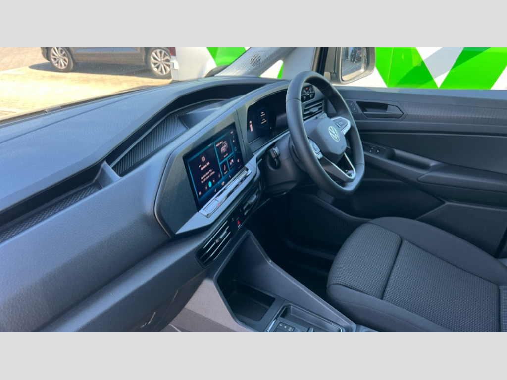 Volkswagen Caddy 2.0 TDI 122PS Commerce Plus Van DSG [Tech Pack] Bluetooth - Mobile phone interface, Car2X technology, Driver alert system, eCall emergency system, Intelligent Speed Assist, Lane assist, Seatbelt warning indicator, Service indicator, Start-stop system with regenerative braking, 2 USB interfaces type C in dashboard, DAB Radio, We Connect Basic Preparation, Automatic hazard light activation under emergency braking, Electric front windows, Heat insulating windscreen, Roof rail preparation, Windscreen wiper with variable intermittent delay and wash-wipe system, Dimming breakaway interior rear view mirror, Electronically controlled heating system, ergoComfort seats for driver, Interior light in headliner incorporting LED technology, Lockable glove compartment door with light, Manual heating and ventilation system, Manual height adjustment for front seats and seat cushion inclination and depth adjustment on drivers seat, Multi function leather steering wheel, Power-adjustable lumbar support for drivers seat, Reach and rake adjustable steering column, Six lashing points for securing loads, Steering wheel paddle shift, Storage compartments under driver and front passenger seats, Sun visors with mirror, airbag label on front passenger sun visor, 3-point seat belts in front, with pretensioner and height adjustment, Driver and front passenger airbag with front passenger airbag deactivation, Tyre pressure monitoring system, Anti-theft alarm system, interior monitoring, backup horn, and towing protection, Electronic engine immobiliser, Remote central locking with deadlocks, interior locking, Anti locking braking system (ABS), Automatic post collision braking system, Brake assist, Diesel particulate filter, Electric parking brake with auto hold function, Electronic brake force distribution (EBD), Electronic differential lock (EDL), Electronic stabilisation programme (ESP), Engine drag torque control (MSR), Hill hold assist, Traction control system (TCS), Decorative beige birch vein inserts, Full size wheel trims
