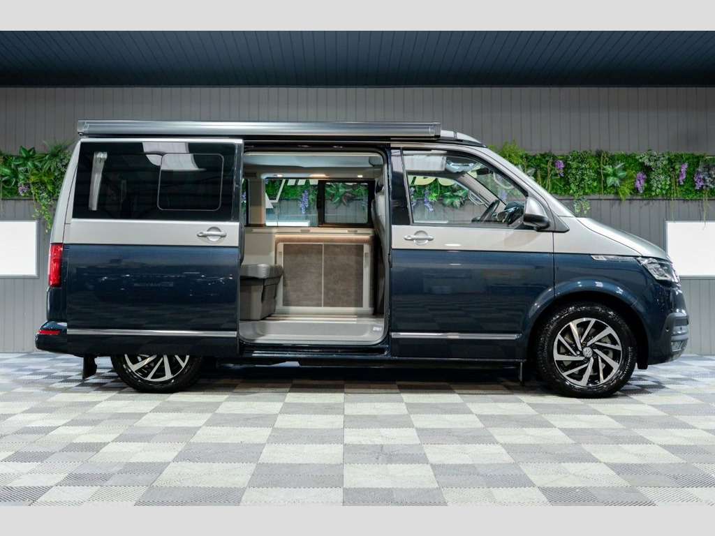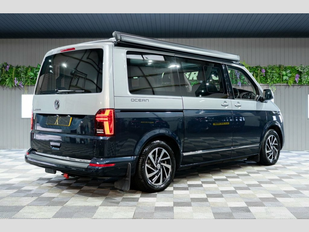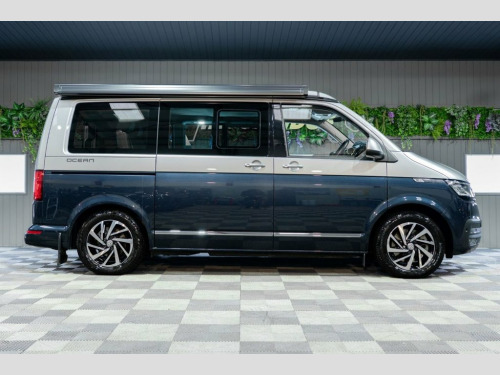 Very Rare top specification 2023 Volkswagen California Ocean 150bhp DSG automatic finished in sought after two-tone Starlight blue metallic and Palladium Silver paint. Full VW history from new. Optional Specification: £Chrome Pack - £504.00 £18in Alloy Wheels - 8J Teresina - Black Diamond-Turned - £1104.00 £Bed Extension with Comfort Sleeping Mat - £354.00 £4x Remote Control Folding Keys - £138.00 £Floor Covering - Wood Effect - £540.00 £Reflex Silver-Starlight Blue - £3096.00 £Fiamma Wind out side awning - £1,200.00 Full bookpack, service history, all the keys are present and correct. Standard Features: The Ocean trim includes 17-inch alloy wheels (previous owner upgraded these to 18" Alloys) , an electric pop-up roof, three-zone climate control, and a well-equipped kitchenette with a two-burner hob, fridge, and table. Interior: The interior features a spacious layout with comfortable seating, a bed, and various storage compartments. It also includes blackout blinds and an enhanced blackout system for a comfortable sleep. Technology: The California Ocean comes with the Ready 2 Discover Infotainment System with a 10-inch display, and it can be upgraded with the Discover Media navigation system. Key features Interior: Electro-hydraulic elevating pop-up roof for expanded living and sleeping space. Kitchenette with a gas stove, sink, and 42-liter compressor fridge. Dining table, Chrome Pack, 18in Alloy Wheels - 8J Teresina - Black , Bed Extension with Comfort Sleeping Mat, 4x Remote Control Folding Keys, Floor Covering - Wood Effect, Reflex Silver-Starlight Blue, Inlays - Bright Brushed Grey, Art Velours Seat Centre Section and Leat, 1 Waste Bin in Door Storage Compartment , 17in Alloy Wheels - 7J Aracaju - Silver, 17in Brake System Front - 16in in Rear, 230V External Inlet with Charging Featur, 230V Inverter with Socket on Drivers Sea, ABS - Anti-Lock Braking System, ASR - Anti Slip Regulation, Adaptive Cruise Control ACC including Fr, Air Conditioning - 3-Zone Climatronic wi, Anti-Theft Alarm System with Interior Mo, Armrest for Both Cab Seats, Auto-Dimming Breaka