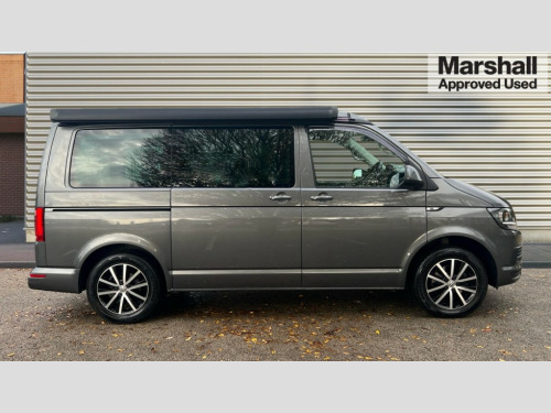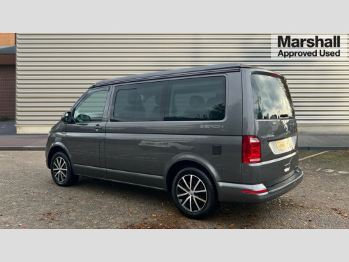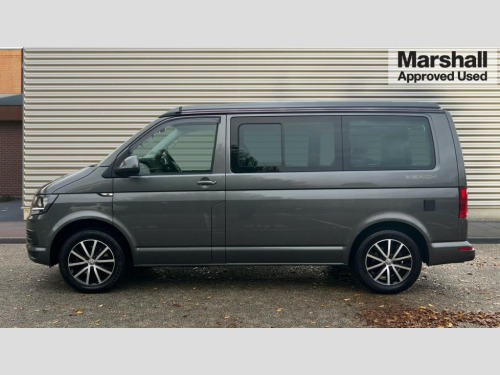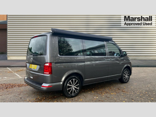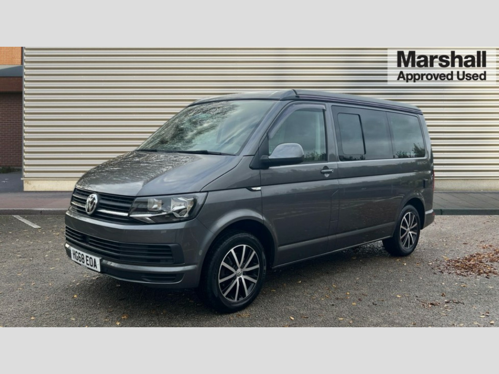 Volkswagen California 2.0 TDI Beach 150 5dr DSG AppConnect, Bluetooth hands free telephone connection, Coolant temperature indicator, Digital clock, Discover navigation, Driver alert system, External temperature gauge, Front and rear parking sensors with rear parking camera, Lockable tailgate, Multifunction display plus, Power Steering, Rev counter, Service interval indicator, Trip computer, Standard suspension, 6 speakers, Auxiliary input socket, Composition colour radio, Composition media system with 6.33" touchscreen, DAB Digital radio, Radio/CD + MP3, USB port, Auto dimming rear view mirror, Black door mirrors, Black roof, Body colour bumpers, Body colour door handles, Body colour side mouldings, Body coloured aluminium pop-up roof with two side windows, Electric adjustable heated door mirrors, Front fog lights with static cornering function, Glazed tailgate, Heat insulating tinted glass, Heated rear windows with wash wipe, High gloss black grille with chrome surround, Intermittent windscreen wipers, LED headlights with LED daytime running lights, LED tail lights, Manual sliding side door - driver's side, Power windows, Privacy glass in storage/passenger compartment with green insulating glass, Range adjustable headlights, Rear privacy glass, Roof rails, Sliding window in passenger compartment drivers side, Sliding window in passenger compartment passenger side, 230V socket, 3 zone climate control, Adjustable dashboard illumination, Auxiliary heater, Bed extension with sleeping mat, Camping table with two folding chairs, Centre console, Driver + passenger lumbar support, Dust/pollen filters, Front door pockets with bottle holders, Front grab handles, Front seat armrests, Front seat backrest storage nets, Head restraints for all seats, Independent rear heating controls, Interior illuminated entry steps, Interior light, ISOFIX top tethers and lower anchor points, Jack and tool kit, Leather gear knob/gaiter, Leather steering wheel, Load restraint lashing eyes, Multi function steering wheel with phone controls, Passenger floor covering in Moonrock grey, Pilion cloth upholstery, Storage net on lower dash passenger side, Sunvisors with illuminated vanity mirrors, Swivelling front seats, Comfort pack - California, Smoking pack - California, ABS/EBD, Brake assist function, Child proof door locks, Door open warning, Driver seatbelt warning indicator, Driver/Front Passenger airbags, Driver/front passenger seatbelt tensioners, EDL, ESP, Front assist including city emergency braking, Front side airbags with curtain airbags, Hill hold control, Manual passenger airbag deactivation function, Two tone horn, Tyre pressure warning, Warning triangle and first aid kit, 2 remote folding keys, Alarm with interior protection, Electronic immobiliser, Locking wheel nuts, Gloss black decorative inserts in dash, 17" Cascavel black alloy wheels, 215/65 R17 tyres with optimised rolling resistance, Full size steel spare wheel, Wheel covers