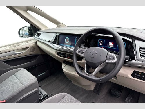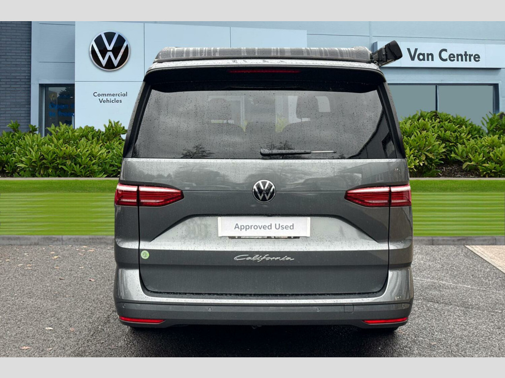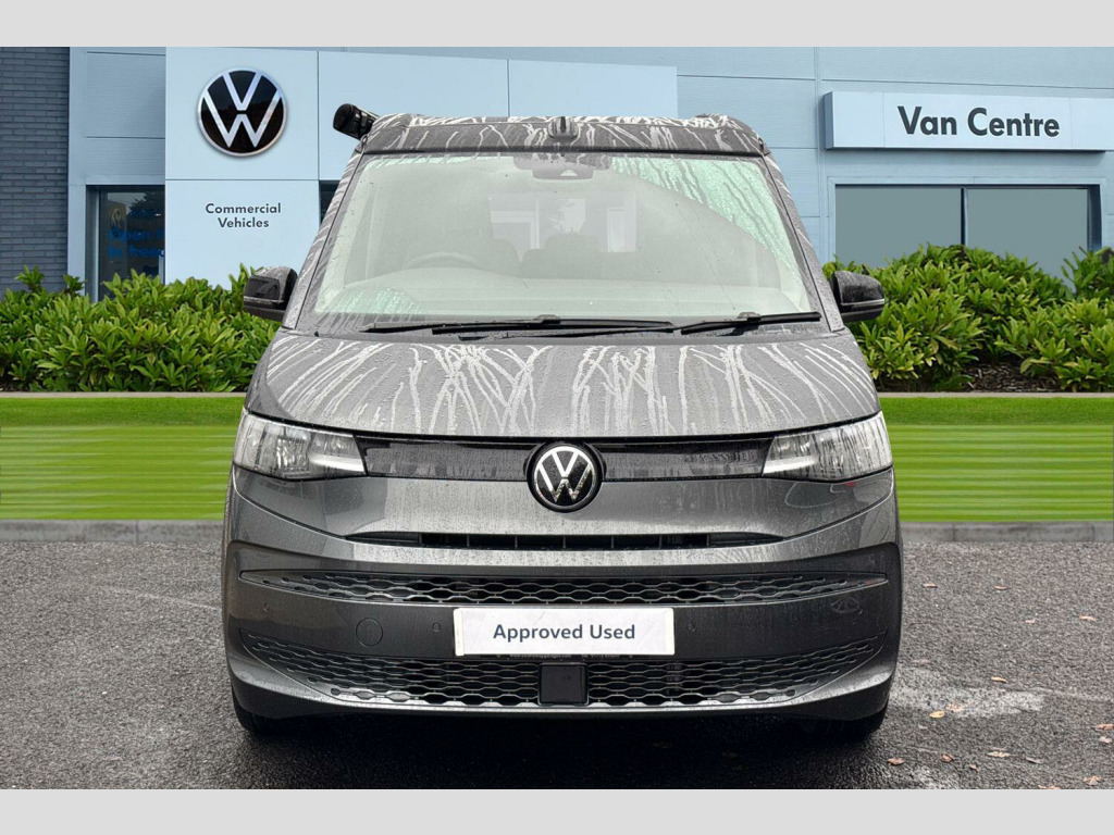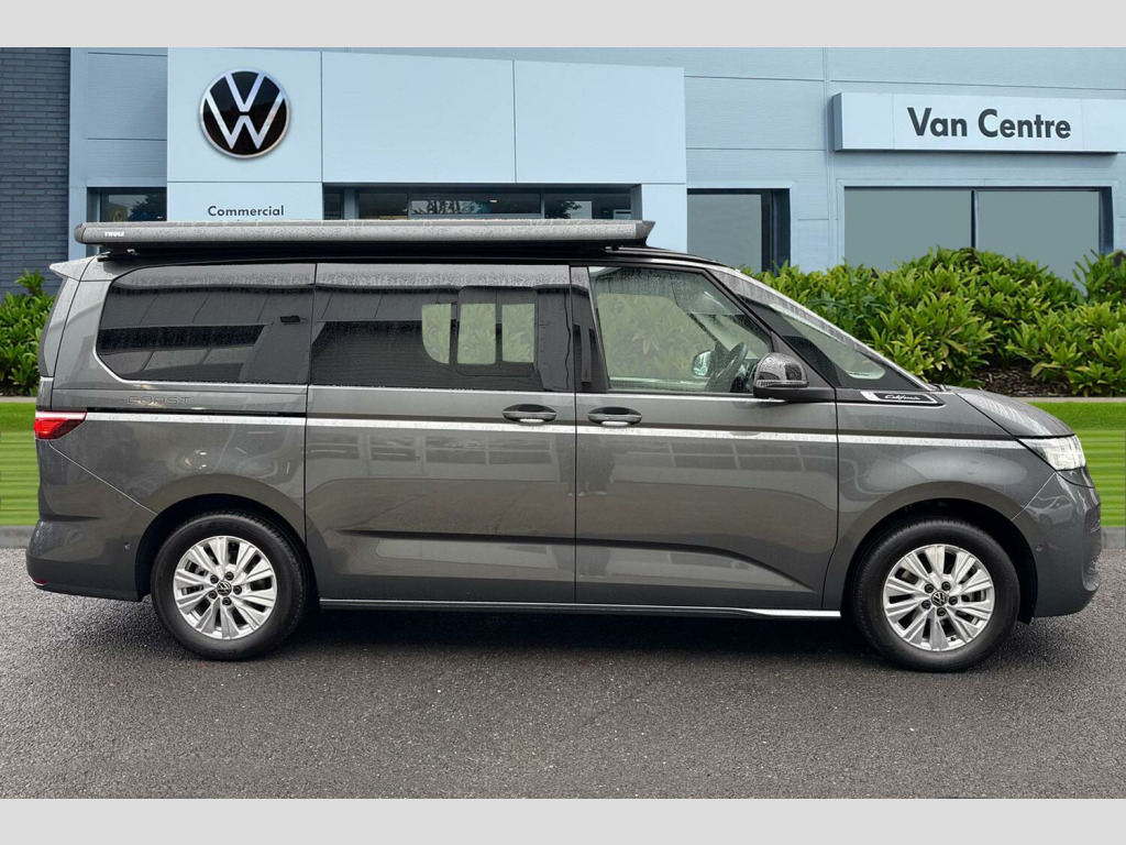 Metallic paint, Rear view camera, Heated front seats, 17" Dundrod silver alloy wheels, Metallic -Indium grey with deep black pearl roof, Retractable towbar with electric release, Four speed control for windscreen wipers, Heat and sound insulating laminated safety glass windshield, Heated windscreen, Interior noise reduction, Sliding window in front and fixed window in rear in load/passenger compartment on driver side, Windscreen wiper intermittent control, Electro hydraulic elevating roof, with three windows including one front passengers panorama opening, canvas in Basalt Grey, Nameplate set California, Radiator grille, Rear boot, 3rd brake light, LED Headlights, Molding between headlamps painted to glossy black, Poor weather light including cornering light, Red LED tail lights, Autonomous emergency braking, Front disc brakes, Swerve support and oncoming vehicle braking when turning, Adaptive cruise control ACC stop and go, Advanced driver attention and drowsiness monitor, Dynamic road sign display, Front cross traffic assist, Lane change assistant, Lane keeping system Lane Assist, Multifunction camera, PAS, Servotronic speed sensitive power steering, Speed limiter and predicative speed limiter, Turn assist with evasive assistance, High gloss black door mirrors, 2x3 point automatic seatbelts at the rear outside with ECE label, with/without belt tensioner, Child locks, Driver and front passenger airbags with front passenger airbag deactivation button, First aid kit with warning triangle and safety vest, Front Assist with pedestrian and cyclist detection, Height adjustable three point automatic seatbelts at front with belt and end fitting tensioners, Occupants detection only display, Side and curtain airbags for driver and front passenger, curtain airbags for outer seats in rear, centre airbag in front, Tyre pressure loss indicator, Warning signal and warning lamp for front and rear seat belts not fastened, California on tour app, Mobile phone interface, Preparation for online services, Preparation for We connect and We connect plus, Volkswagen wired and wireless app connect, 10.4 inch infotainment system with scalable module options, 2 USB-C ports at the front, 4 USB-C charging sockets in the passenger compartment, 8 Speakers, Digital radio reception (DAB), Car2X high variant, eCall emergency system, Digital cockpit pro, Function control unit, IDA voice assistant and voice enhancer, Motorhome Registration, 2nd and 3rd auxiliary batteries with low -voltage converter, Battery 380 A (68 Ah), Battery without capacity specification, Standard battery/generator, Scale light grey decorative inlays, 2 single seats with integrated seatbelt and sleeping mat, Armrest on front swivel seats in both sides with electric lumbar support, Front and rear headrests, Single front passenger seat, Swivel seat on left with height adjustable including drawer, Swivel seat on right with height adjustable including drawer, 3 Zone climatronic air conditioning system, Auxiliary pre-heater, 230V external inlet with charging feature for vehicle batteries, 230V inverter with socket on driver seat, Additional interior noise attenuation, Darkening roller blinds and thermo mats, Drawers under the outer seats in the cab and passenger compartment & 2 waste bins, Interior lighting on pop-up roof, tailgate & summer kitchen and ambient lighting in roof frame, Lockable glove compartment without lighting, Plastic floor covering in passenger/load compartment, Storage compartment left and right 1st row of seats, Summer kitchen with outside folding table and 230-V outlet for cooking, in Raven/Platinum Sandwick, Surround lighting in door area, Without loading edge protection, Without luggage compartment cover, Camper interior lighting, Tailgate latching without unlatching function from inside, Sun visors with mirror, illuminated, ticket holder on the driver side, with airbag label on sun visor and B-pillar, Lighting package - California, Anti theft alarm system with interio